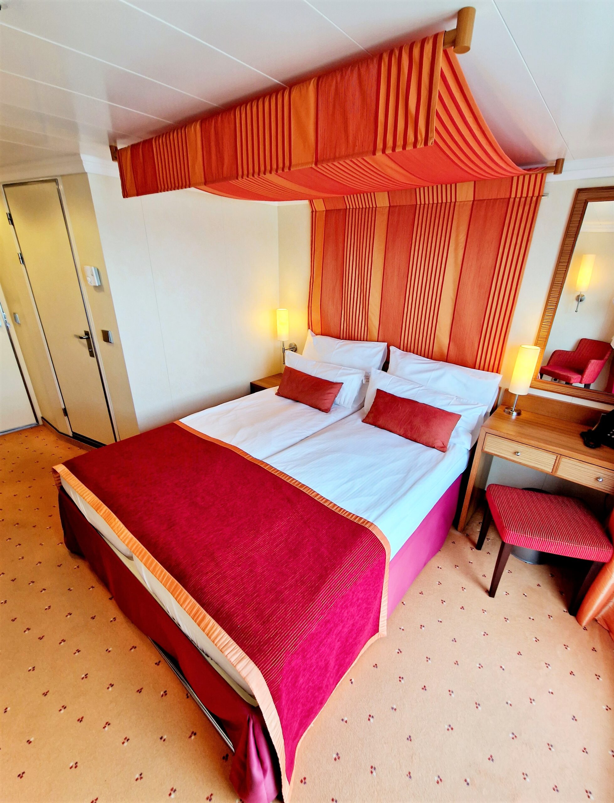 Die Außenkabinen sind mit einem französischem Balkon ausgestattet. Man hat einen einzigartigen Blick von drinnen nach draußen. Das ist ein sagenhaftes Gefühl, wenn man auf dem Bett liegt und man sieht die Landschaft an einem vorbei ziehen.