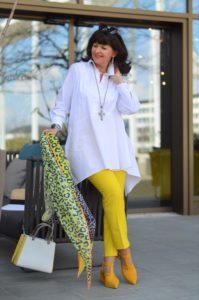 Meine beiden nächsten Favoriten finden sich am Anfang Deiner Vorstellung: Die weiße Longbluse zusammen mit der pastellblauen Handtasche und den fast gleichfarbigen Sling-Pumps sind eine tolle Kombination, aber noch schöner ist das Farbenspiel mit den Gelbtönen des nächsten Bildes: Die gelbe Hose, die Pumps, die Handtasche und das Tuch sind die warmen Kleckse, die das eigentlich kalte weiß aufpeppen und gleichzeitig auch ein unübersehbarer Blickfang sind.