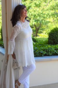 Die stilvolle weiße Bluse kombiniere ich zum Trachtenlook gerne in der Freizeit. Der Leinenblazer in rose und die pinkfarbige Hose sind eine optimale Freizeitkombination. Da ich oft am Tegernsee und in den Bergen meine Wochenenden verbringe, trage ich dieses Outfit besonders gerne.