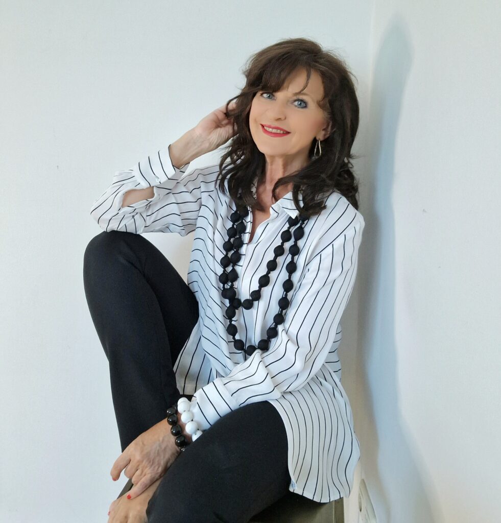Last but not least präsentiere ich Euch meine aktuelle Lieblingsbluse. Sie hat einen leichten schwarzen Streifen. Das Material ist aus fließendem luftigen Material, genau richtig für diese Jahreszeit. Die Bluse finde ich zur schwarzen schmalen Hose besonders stilvoll. Die schwarze Statement-Kette aus Meran ist mein Hingucker bei diesem Look. Dazu kombiniere ich die Armbänder in schwarz und weiß. Ein toller Look für den Sonntags-Brunch oder für den Casual Business Look.