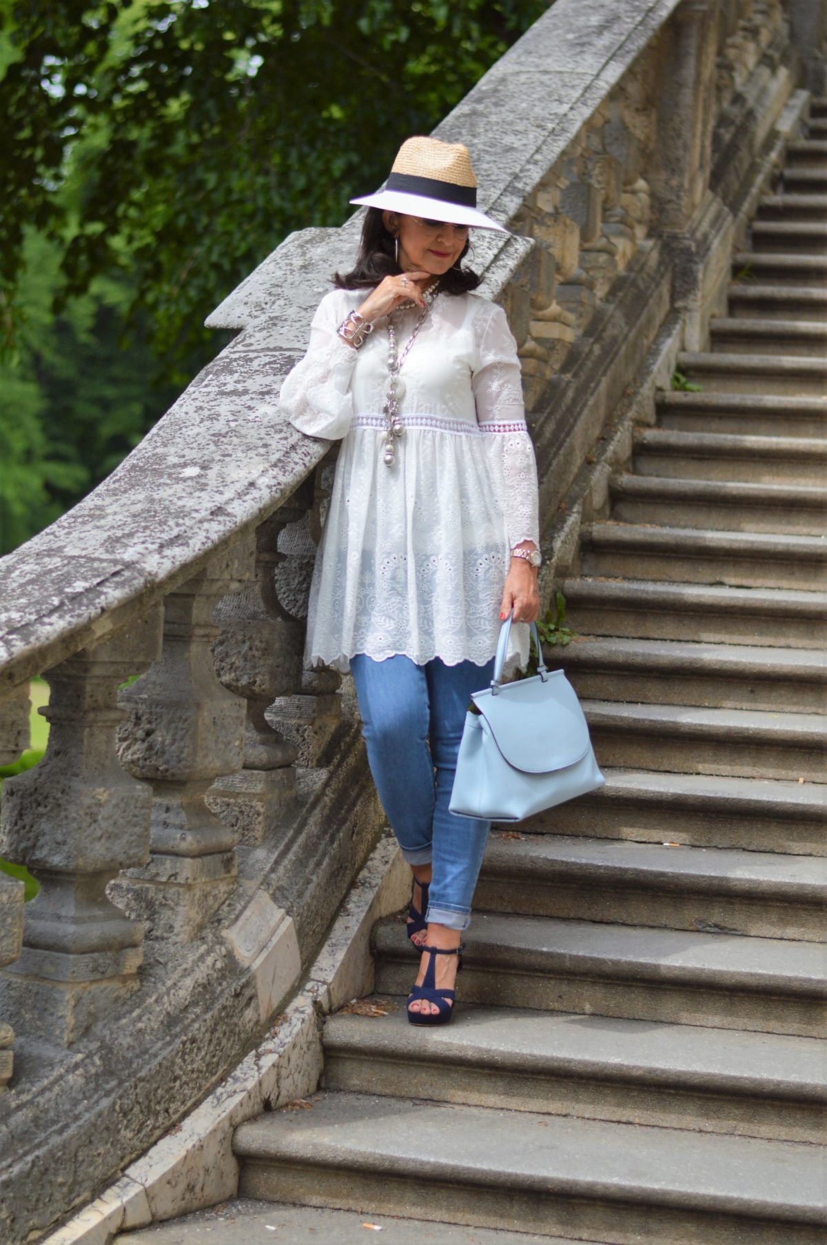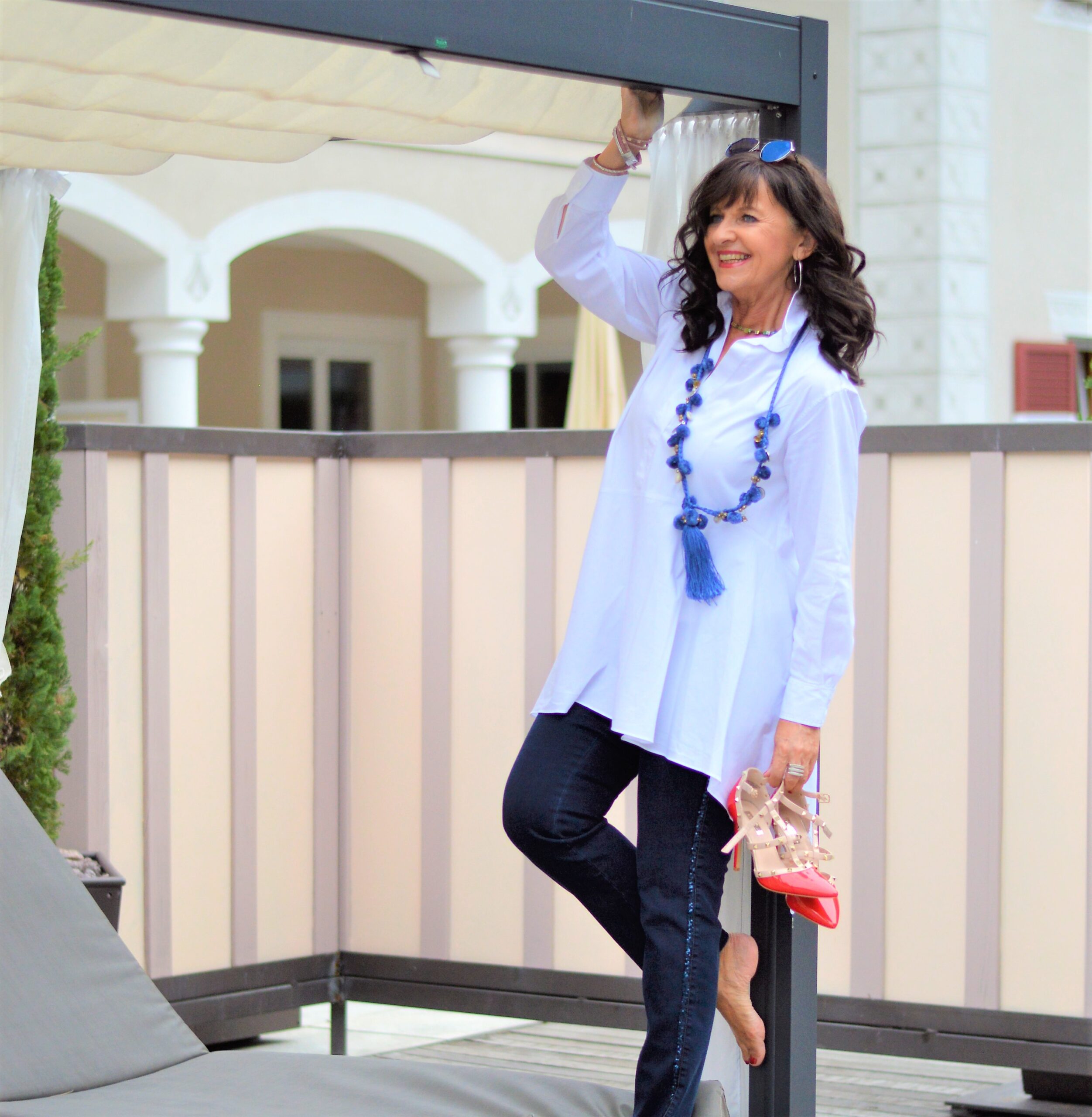 alle gezeigten Kombinationen sind wieder Spitzenklasse! Die weiße Long-Bluse mit Halbarm ist mein Favorit. Eine ähnliche trage ich auch gerne mit weiß/blau gestreiftem Top zu schmalen Stonewashed-Jeans mit Statement Kette und breiten Armreifen. Dazu Haarband, Basttasche und flache Zehentrenner farblich abgestimmt. Weiß-blau ist doch immer wieder eine tolle Farb-Kombi. Wegen meiner Leuchtturm-Größe verzichte ich lieber (leider!!!) auf hohe Absätze. Da beneide ich Dich (und meine Freundin) schon ein wenig um eure Größe… Naja, man kann eben nicht alles haben.