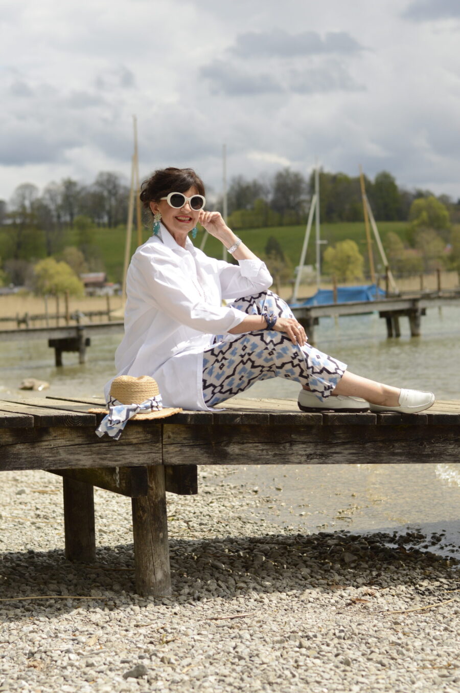 Die kurzärmelige Sommerbluse ist in weiter Schnittführung gestaltet. Sie sieht zur farbigen Hose genauso gut aus, wie zur weißen Jeans. Als weiteren Farbklecks trage ich ein kleines Nickituch in den Farben der bunten Hose dazu. Eine weitere Kombinationsmöglichkeit ist es, die weite weiße Bluse zur Bermuda zu tragen. Ein absoluter Hingucker ist die Kombination mit schwarzen Highheels und schwarzem Hut.