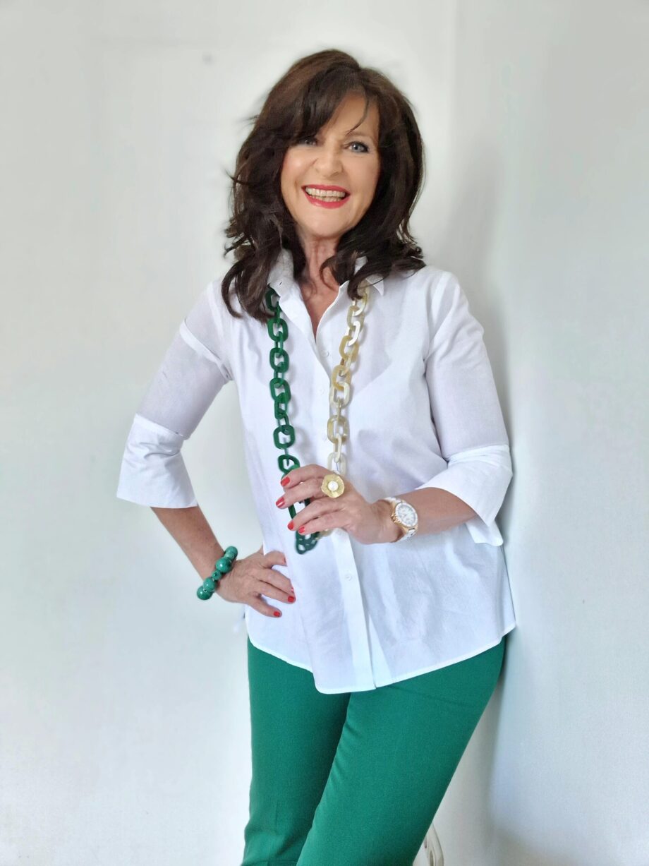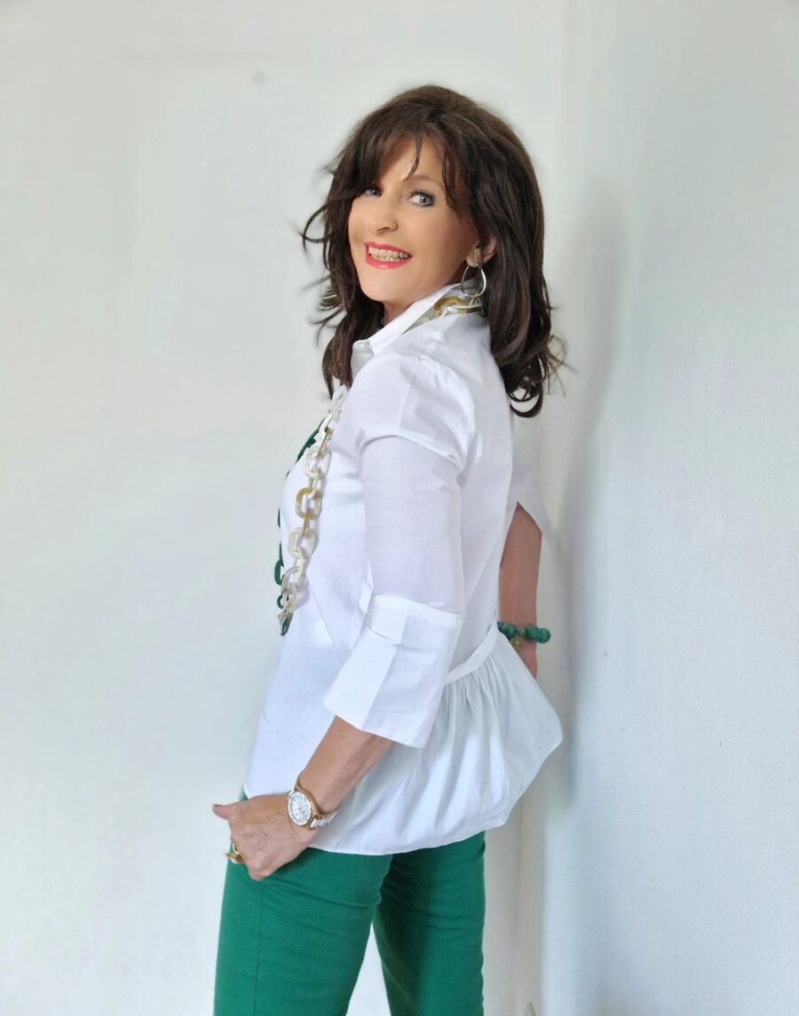 grüne Hose und weiße Bluse, ein Hingucker und immer schick anzusehen.