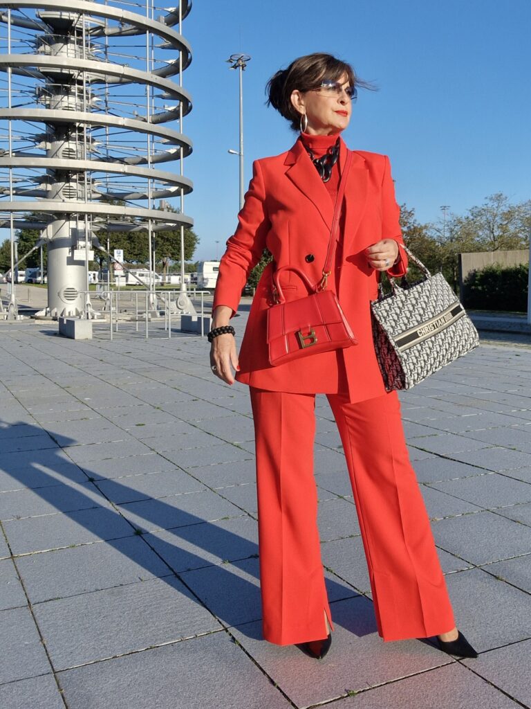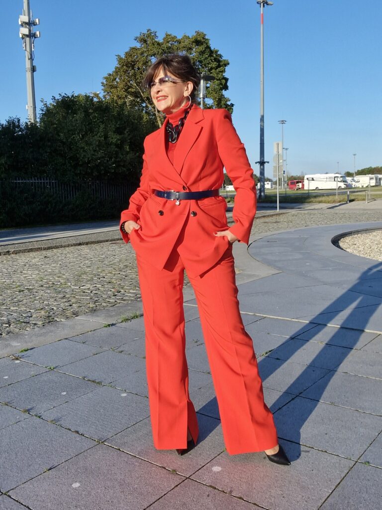 Die Farbe Rot macht den Hosenanzug sofort zum Hingucker. Ton-in-Ton ist bei meinem Look angesagt. Nach so vielen farbigen Looks in der schönen Sommerzeit ist der monochrome Look eine gute Abwechslung in der Outfitplanung.