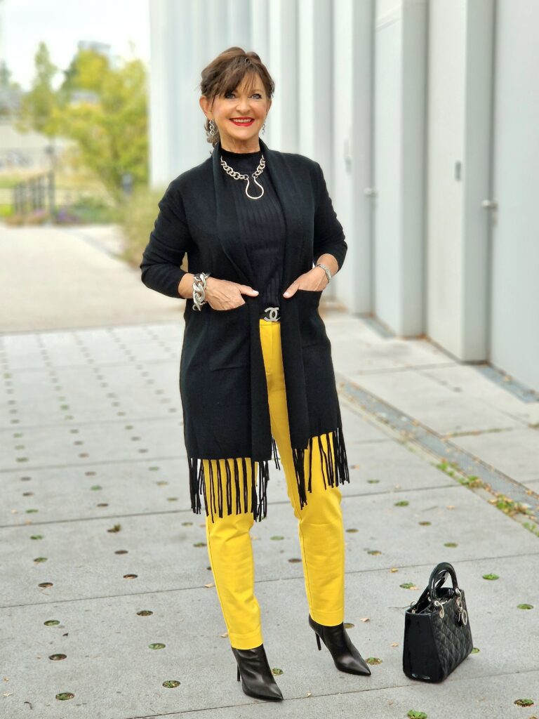 Hosenanzüge sind nicht nur in grau und schwarz ein Fashion-Statement. Ich habe mir einen in der angesagten Herbstfarbe curry ausgewählt. Die Farbe hat mich sofort angesprochen, da ich diesen Anzug mit schwarz wunderbar kombinieren kann. Ob als kompletter Hosenanzug oder die Hose mit der angesagten Strickjacke mit Fransen zu kombinieren – er ist und bleibt ein Eyecatcher für alle Ladys, die Farbe lieben.