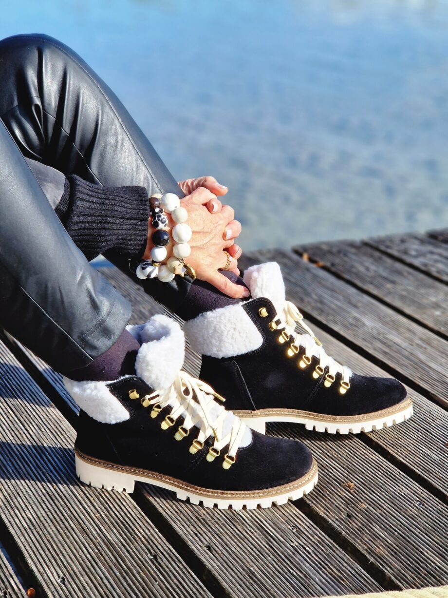 Monochrom in schwarz und Lederlook. Ein Outfit perfekt für einen entspannten Tag am See. Für einen Ausflug an den Tegernsee passen die bequemen und kuschelig warmen Stiefel hervorragend zum Outfit. Ich freue mich schon, mit diesen Boots durch den ersten Schnee zu laufen.