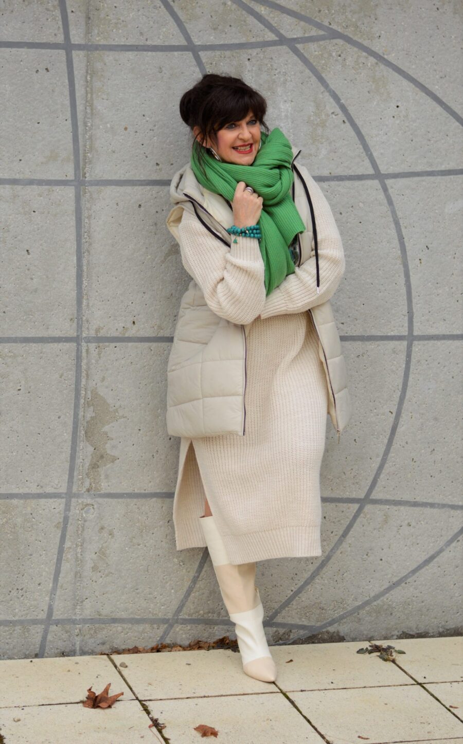 Zwei Trends in dieser Saison sind Steppweste und Strickkleid. Ob Du es Ton-in-Ton trägst, oder als Kontrast – wie ich mit dem grünen Kleid und der hellen Steppweste kombiniert habe – das ist Deiner Vorliebe überlassen. Auf jeden Fall ergeben beide zusammen einen absoluten Eyecatcher.