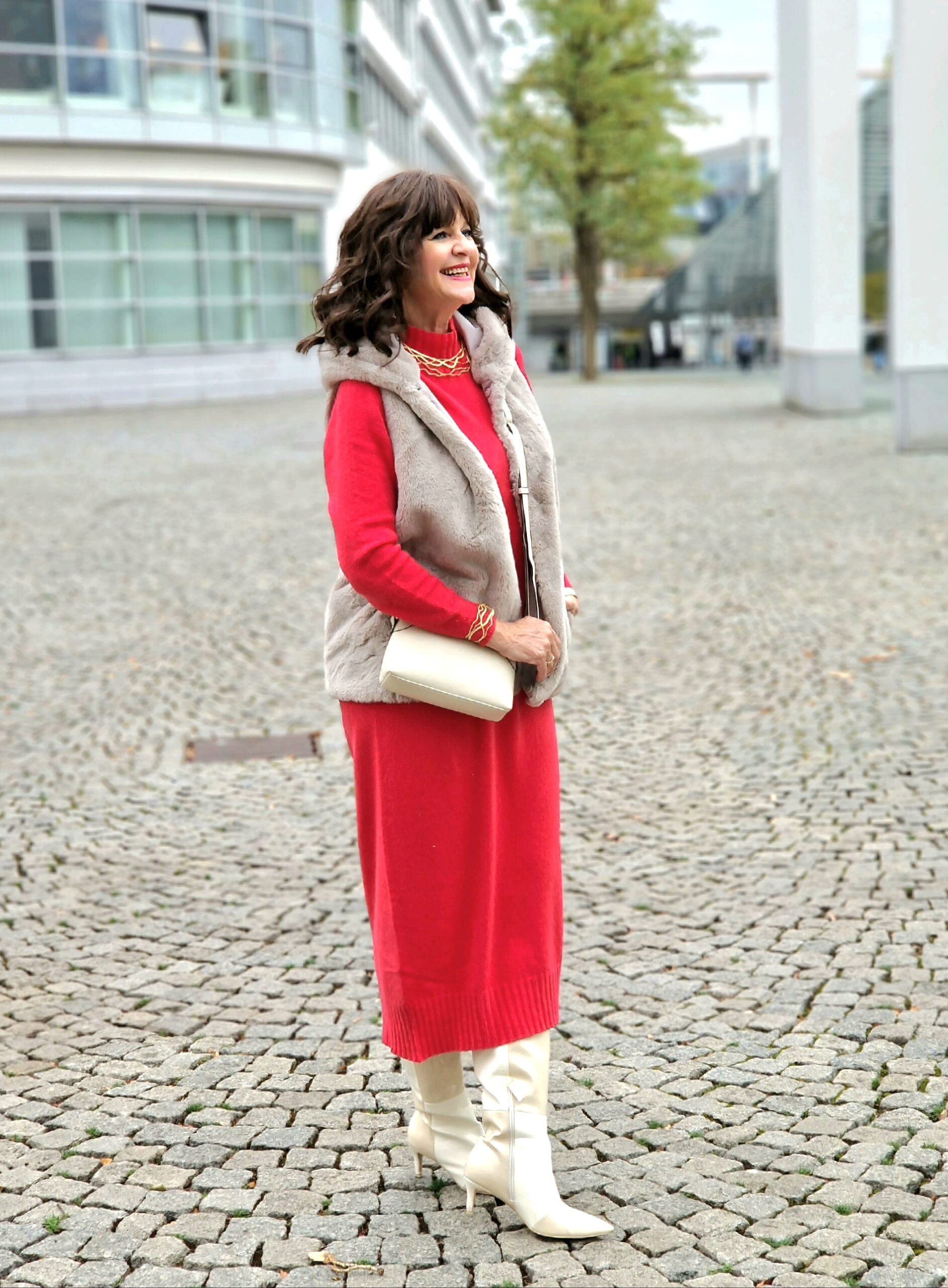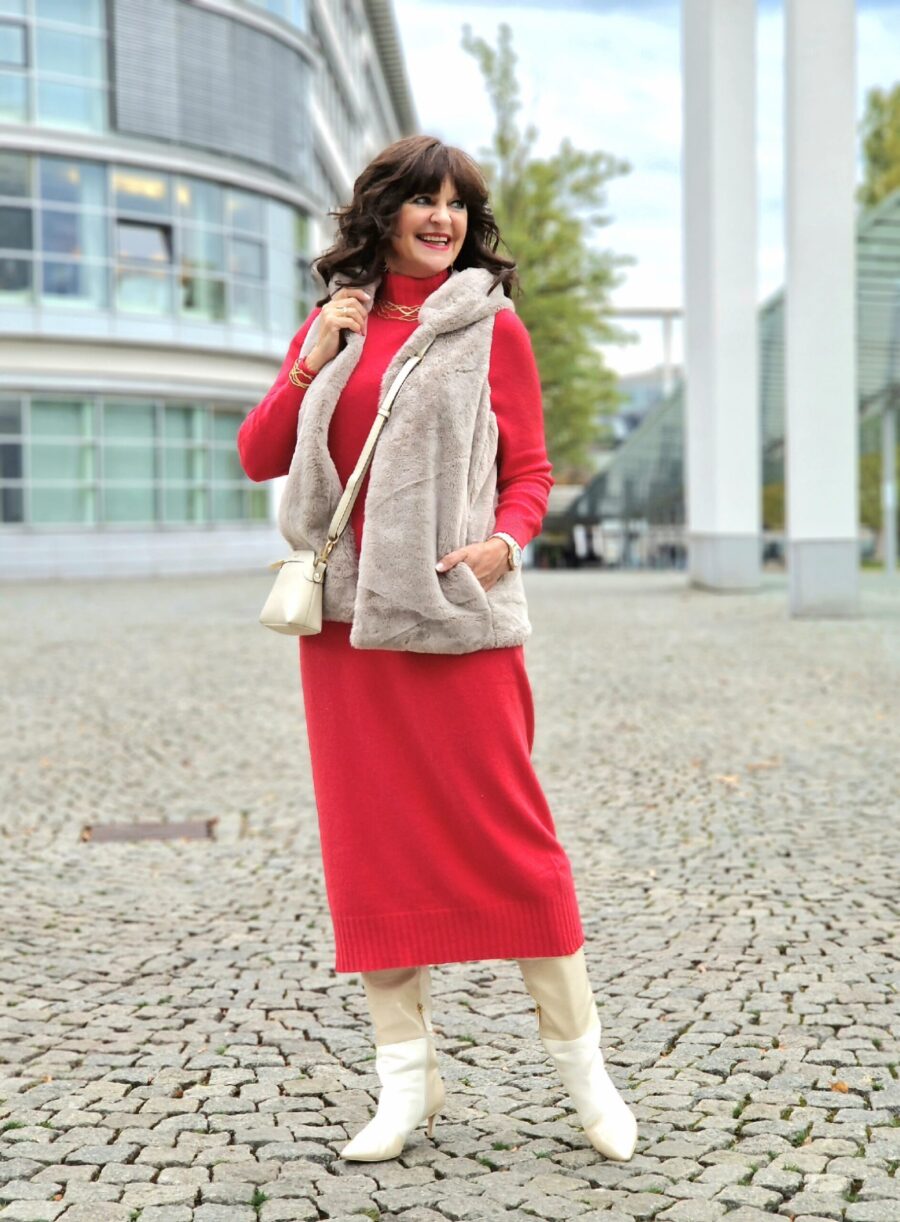 Vor kurzem ist mir die kurze Fellweste wieder im Kleiderschrank begegnet. Sie gehört eigentlich zu einem Wintermantel. Aber im Handumdrehen habe ich diese umgestylt und zum Strickkleid kombiniert. Ideen muss Frau einfach haben. Eine kuschelige Alternative zu einem Kleid in der kühlen Jahreszeit.