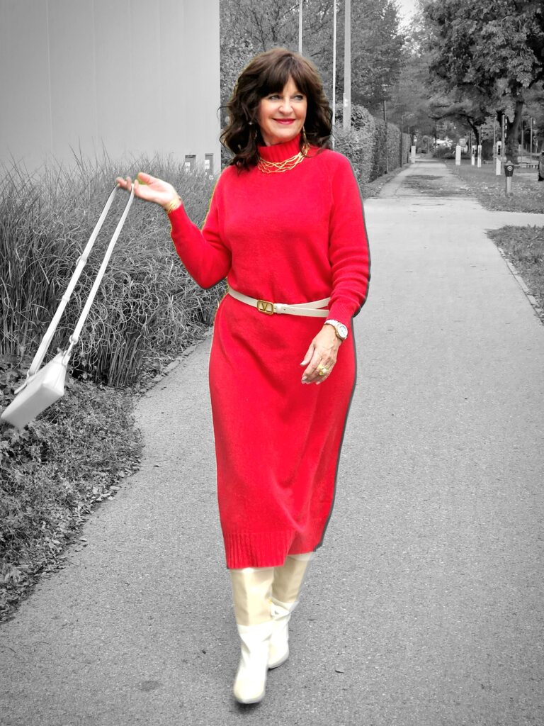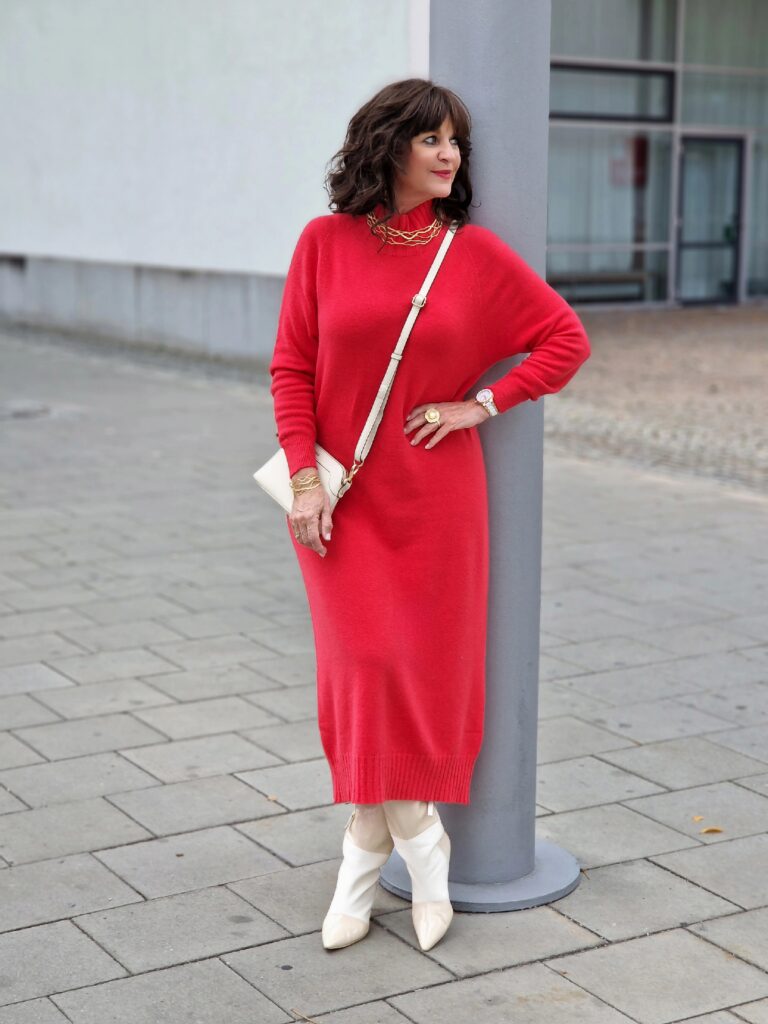 Mein Kleid in Rot ist in der Oversize-Schnittführung. Darunter kann ich ein leichtes Shirt tragen. Bei figurbetonten Strickkleidern solltest Du immer Shape Wear, also figurformende Wäsche darunter tragen. Ein Strickkleid sollte nie einengend sein. Es ist durchaus ratsam, ein Strickkleid lieber etwas größer als zu klein zu kaufen.
