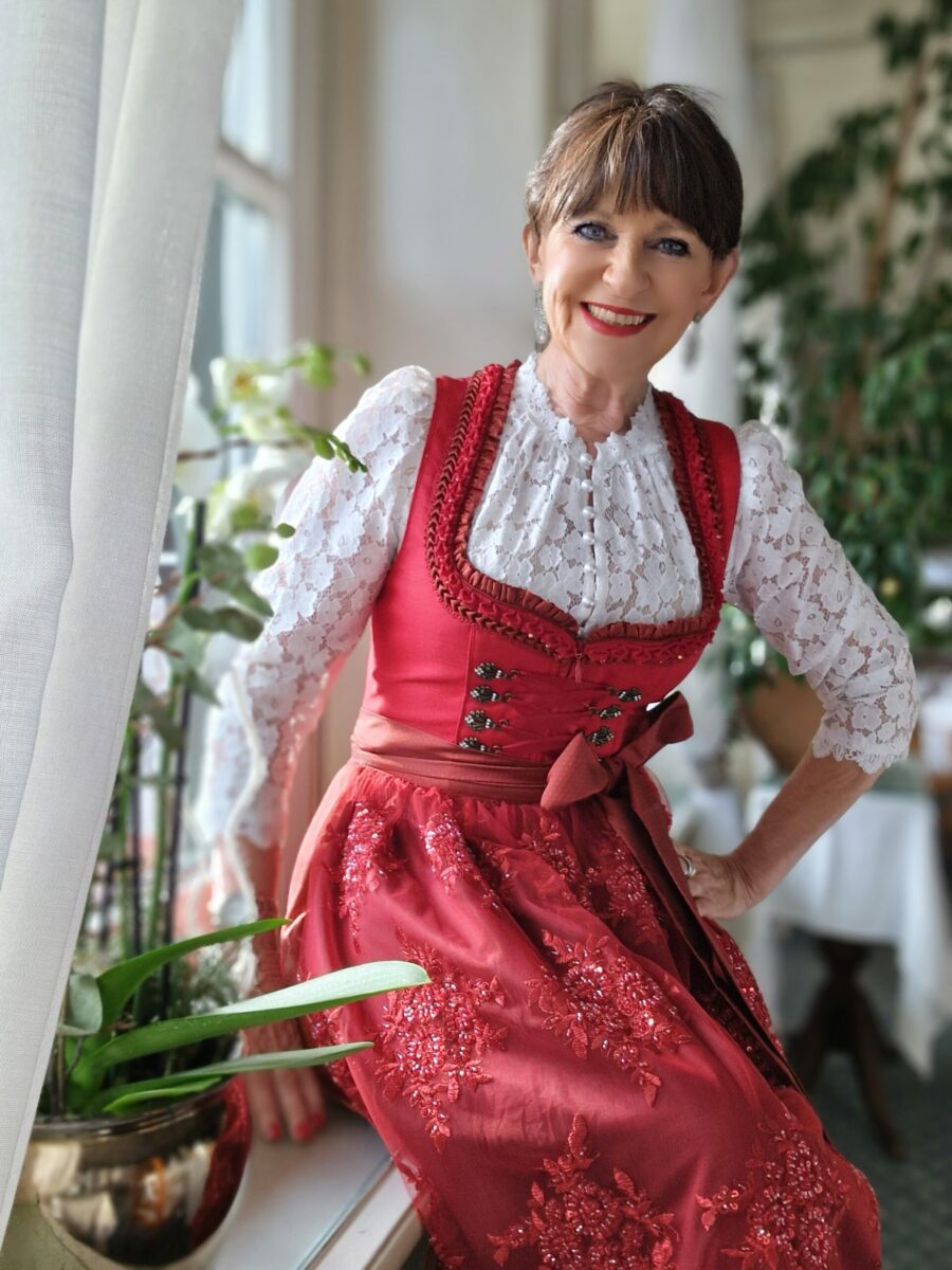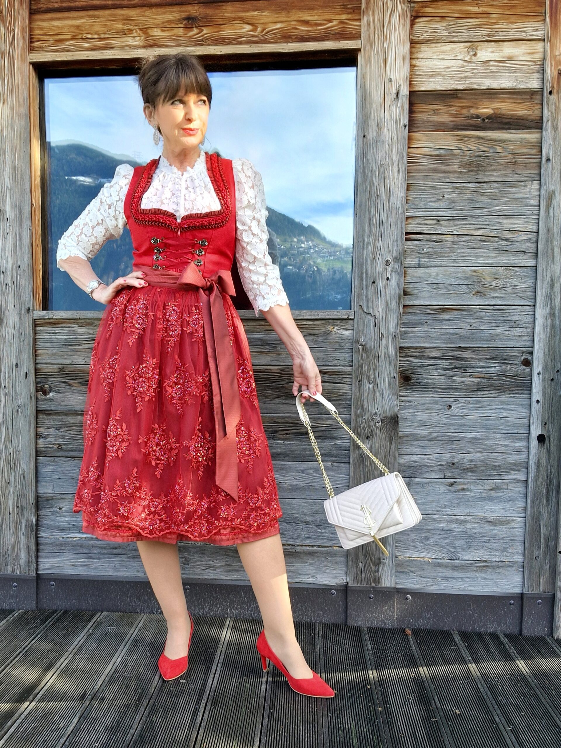 Bei fast jeder Reise begleitet mich eines meiner inzwischen 16 (oder sind es sogar 17?) Dirndl. Mein neues rotes Dirndl ist prädestiniert als Outfit, für einen Urlaub in den Bergen. Das rote Dirndl hat ein paar Glanzeffekte in der Schürze und im Mieder ist es geschnürt. Ein edles Dirndl, das vor allem für besondere Anlässe zum Einsatz kommt.