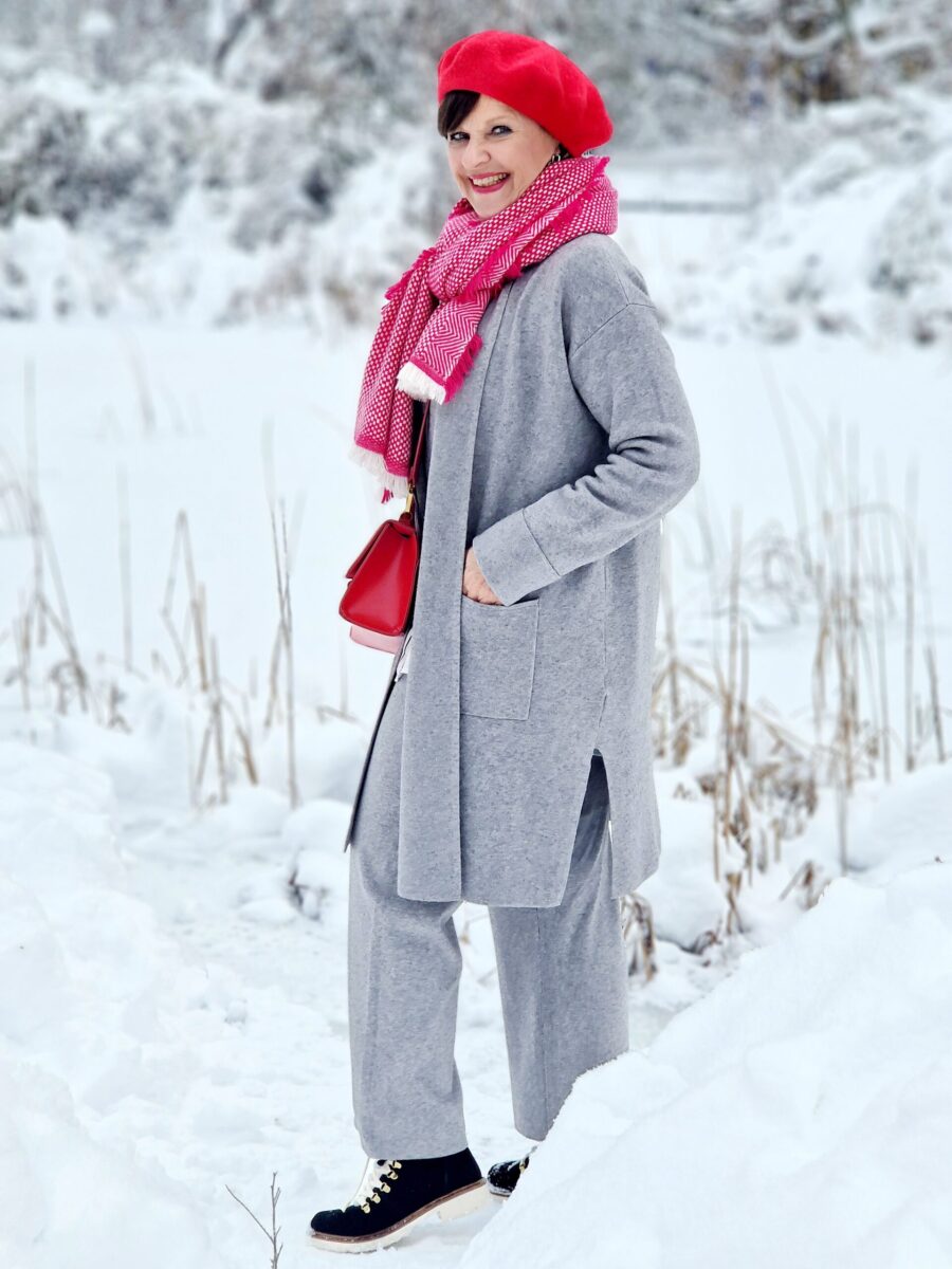 Mein grauer Strick-Dreiteiler ist lässig und zeitlos. Ich kann die Hose, die Jacke und den Pulli genauso gut zu anderen Basisteilen tragen. Der Schal fehlt zur Winterzeit als Accessoire nie bei mir.