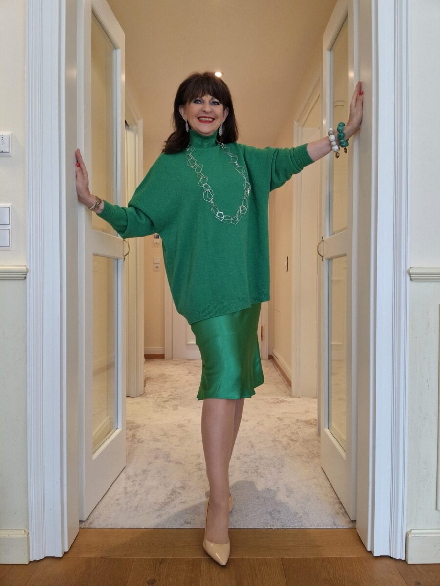 Bezaubernd das grüne Seidenkleid mit dem Pulli und den beigen Pumps, genau mein Stil für den späten Nachmittag und Abend! Ich trage gern ein ähnlich langes Kleid in dunkelblau, (das passt besser zu meinem Typ), und kombiniere es ebenso mit einem Oversize-Pulli und farblich abgestimmten Ballerinas oder Stiefeln.