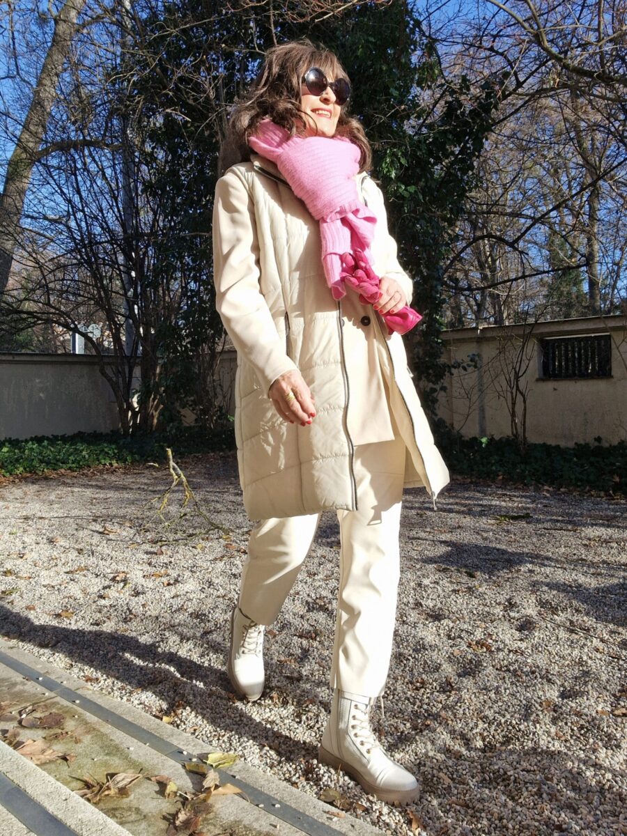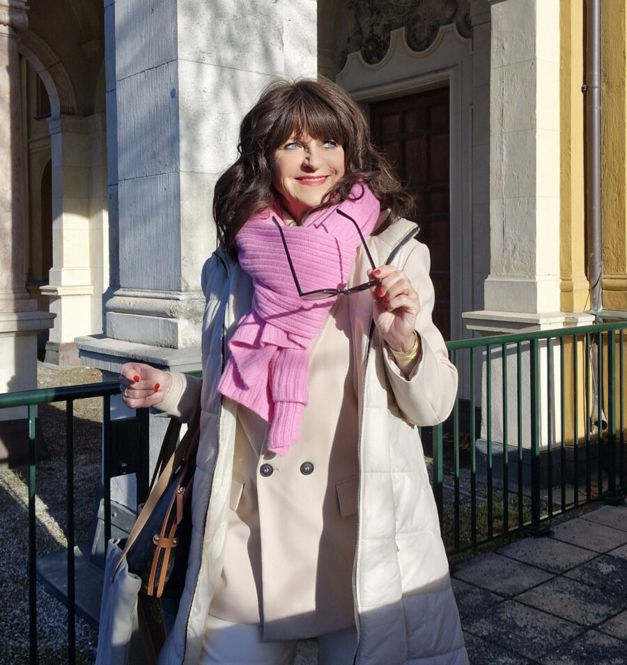 Der Steppmantel oder die Steppjacke sind unerlässlich. Je nach Temperatur greife ich zu diesen unverwüstlichen Oberteilen. Sie sind Allrounder für jedes Outfit im Winter. Sie knittern nicht, können ganz klein gefaltet werden und wenn man sie anzieht, sehen sie aus wie neu. Als Eyecatcher zum monochromen Look greife ich zum rosefarbigen Cashmere Schal.