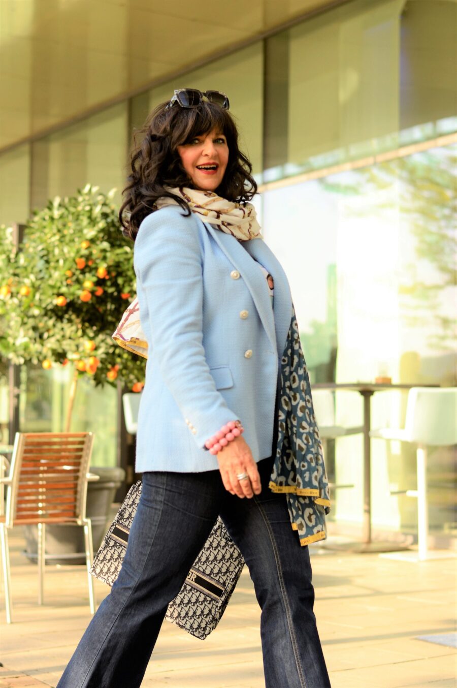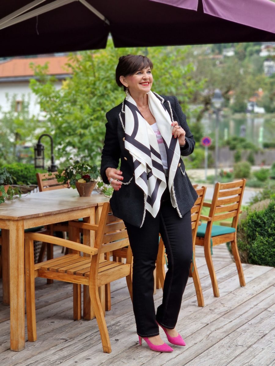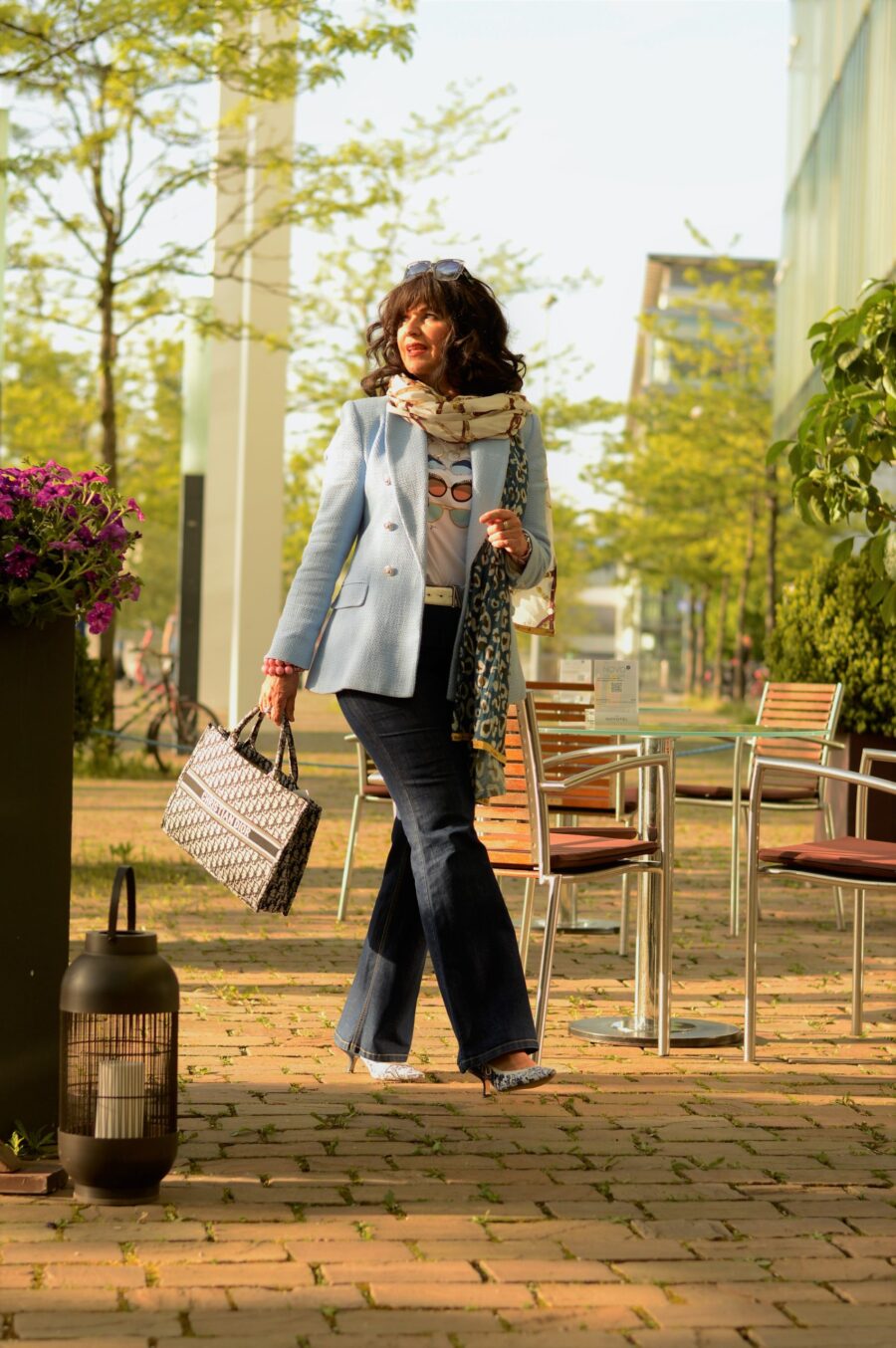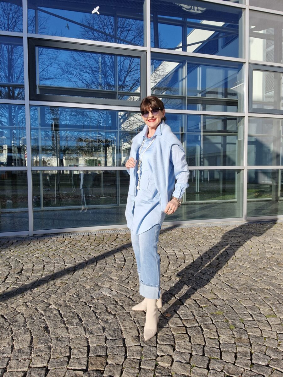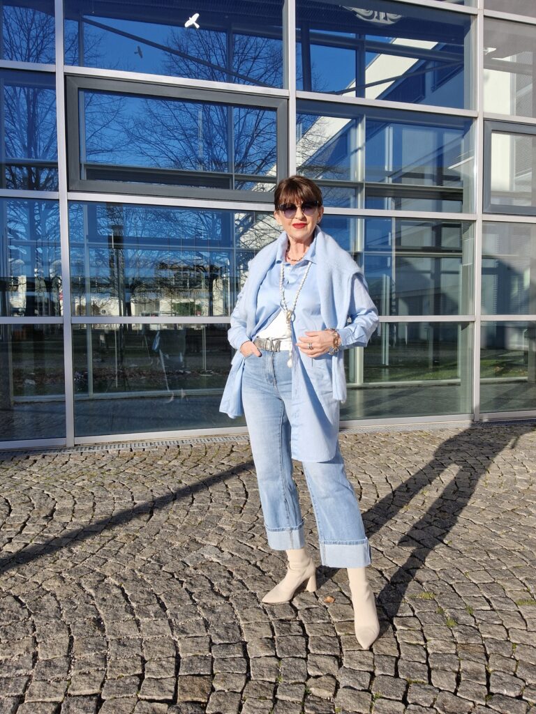 Bei all den Modetrends, sollten wir unsere blaue Jeans nicht vergessen. Meine blaue Jeans ist im Beinverlauf leicht ausgestellt. Das ist immer eine vorteilhafte Form für Damen mit einer etwas breiterer Hüfte bzw. stärkeren Oberschenkeln. Mit einem Blazer sieht sie zum Businesslook immer klassisch und zeitlos aus. Quasi eine echte Frauenversteherin, die uns immer ein gutes Gefühl gibt.