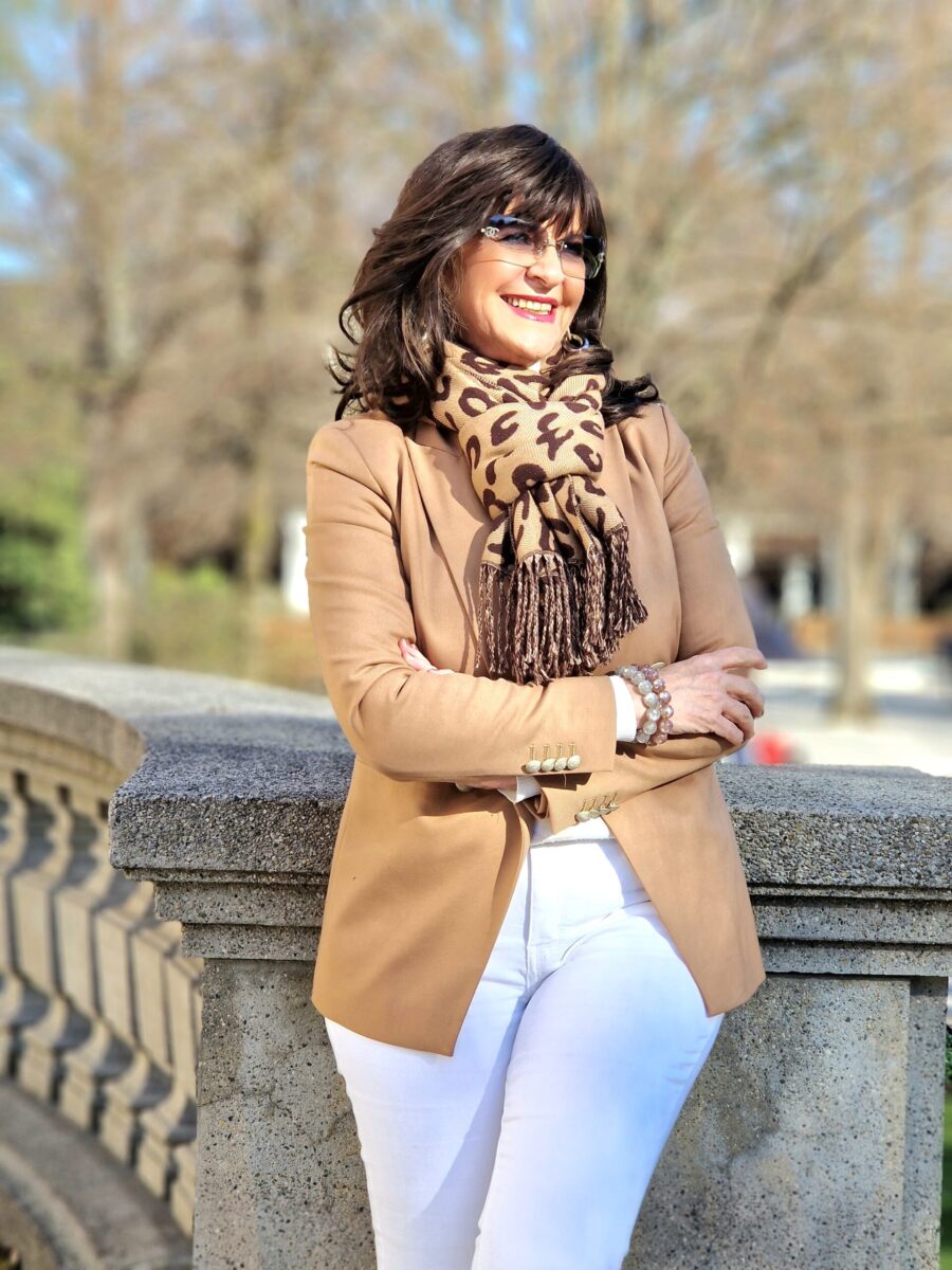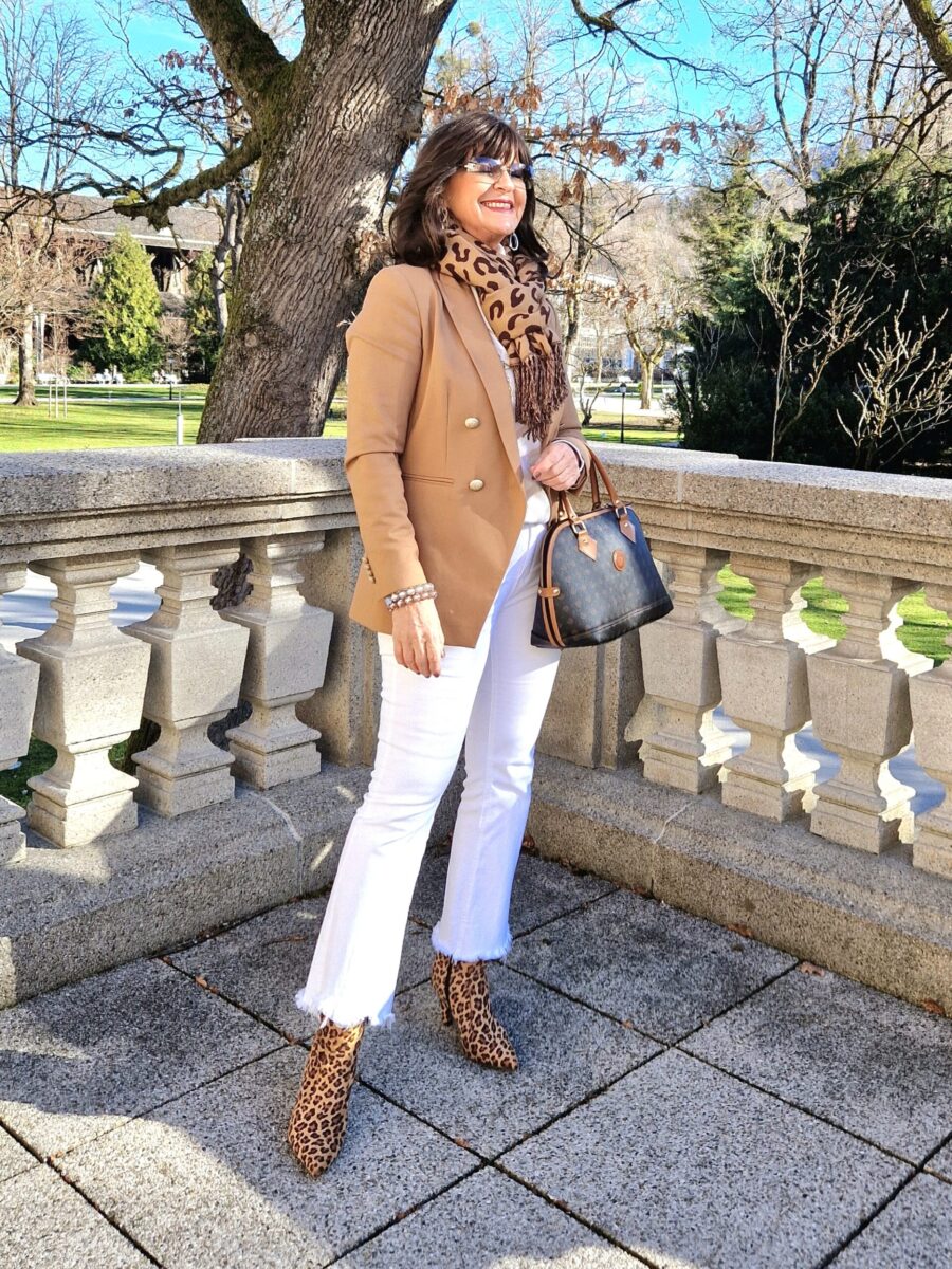 Frühlingshafte Temperaturen sind angesagt. Da kommt die weiße Jeans gerade recht. Ich kombiniere sie mit einem beigen Blazer. Als Eyecatcher kommen meine Animalprint Stiefeletten zum Einsatz. Für alle Liebhaberinnen dieser Stiefeletten muss ich leider sagen, dass diese schon älter sind und mindestens seit 3 Jahren bei mir leben. Ich wiederhole den Print in meinem extravaganten Schal, den ich gerne zu beigen Outfits kombiniere.