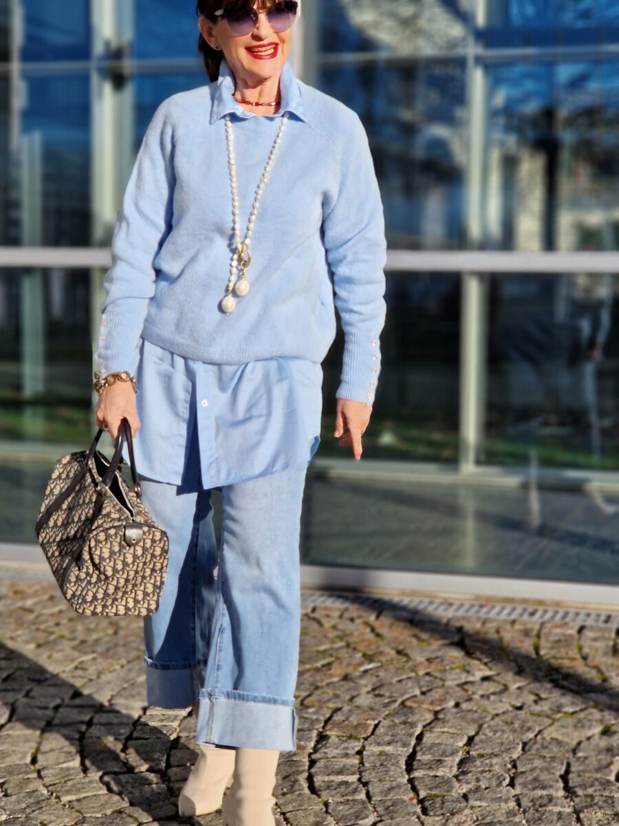 der hellblaue Look mit der Jeans mit Umschlag ist auch eine meiner Favoriten. Sei mutig und trage eine farbige Jeans. Sicherlich trägst Du im Frühjahr farbige Hosen, oder?
