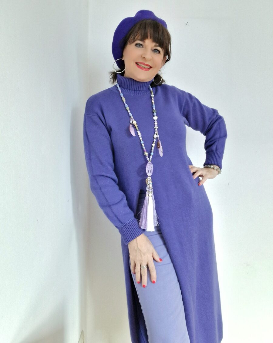 Die Farbe LILA, war einmal ein Film und an diesem Titel muss ich immer denken, wenn ich diese Kombination aus Lila-Tönen trage. Lila ist definitiv nicht vielfältig in meinem Kleiderschrank vorhanden. Aber das raffinierte Strickkleid gefällt mir ausgesprochen gut zu meiner Jeans in zarten Fliedertönen.