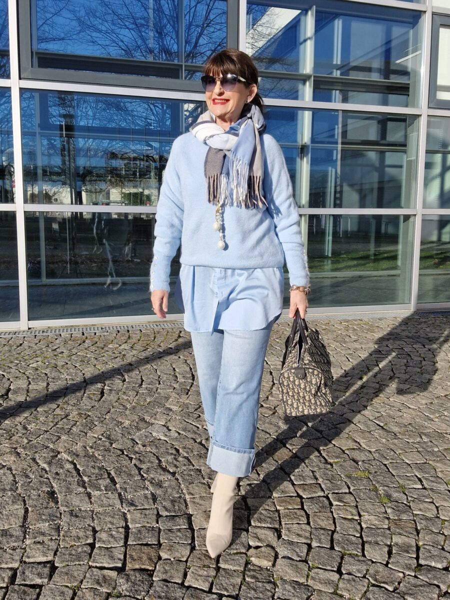 Bestimmt bist Du erfolgreich gewesen beim Nachstylen mit weißer Jeans und hellblauem Pulli.