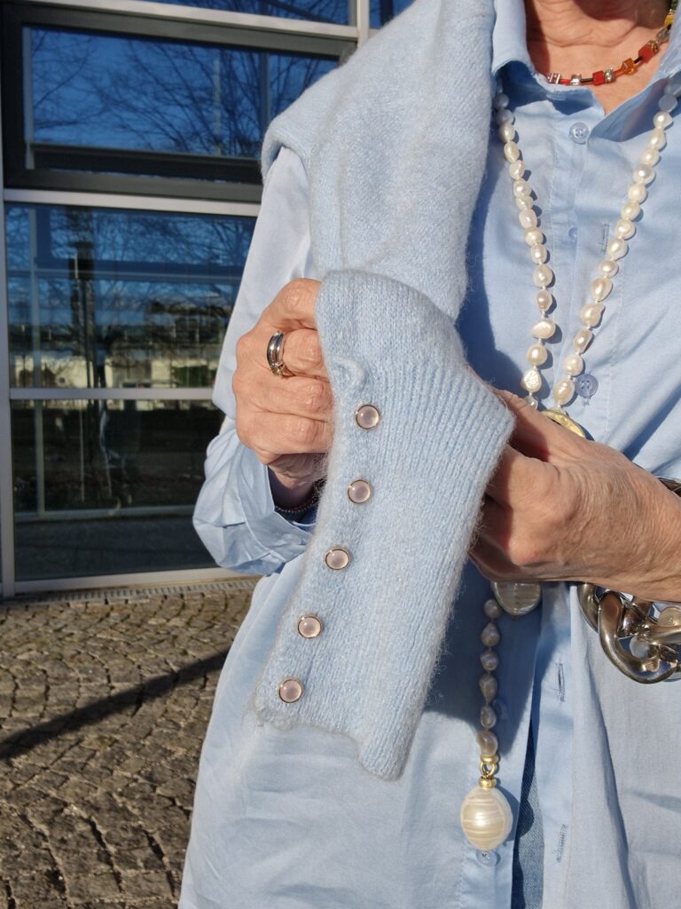 Der zauberhaft leichte Pullover mit 30 % Baby Alpaka Wolle, ist mein absoluter Frühlingsliebling. An den Ärmeln ist er mit einer besonderen Knopfleiste verzieht. Gerade in der Übergangszeit liebe ich die leichten kuscheligen Pullis und Cardigans. Der Pulli ist ein wirklicher Allrounder. Er ist ein idealer Reisebegleiter und im Alltag sorgt er für die richtigen Streicheleinheiten. Denn er lässt sich problemlos auf der Haut tragen.