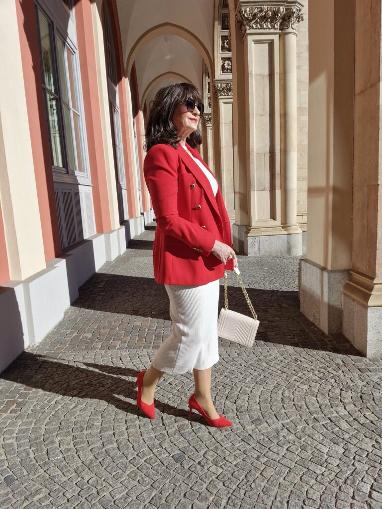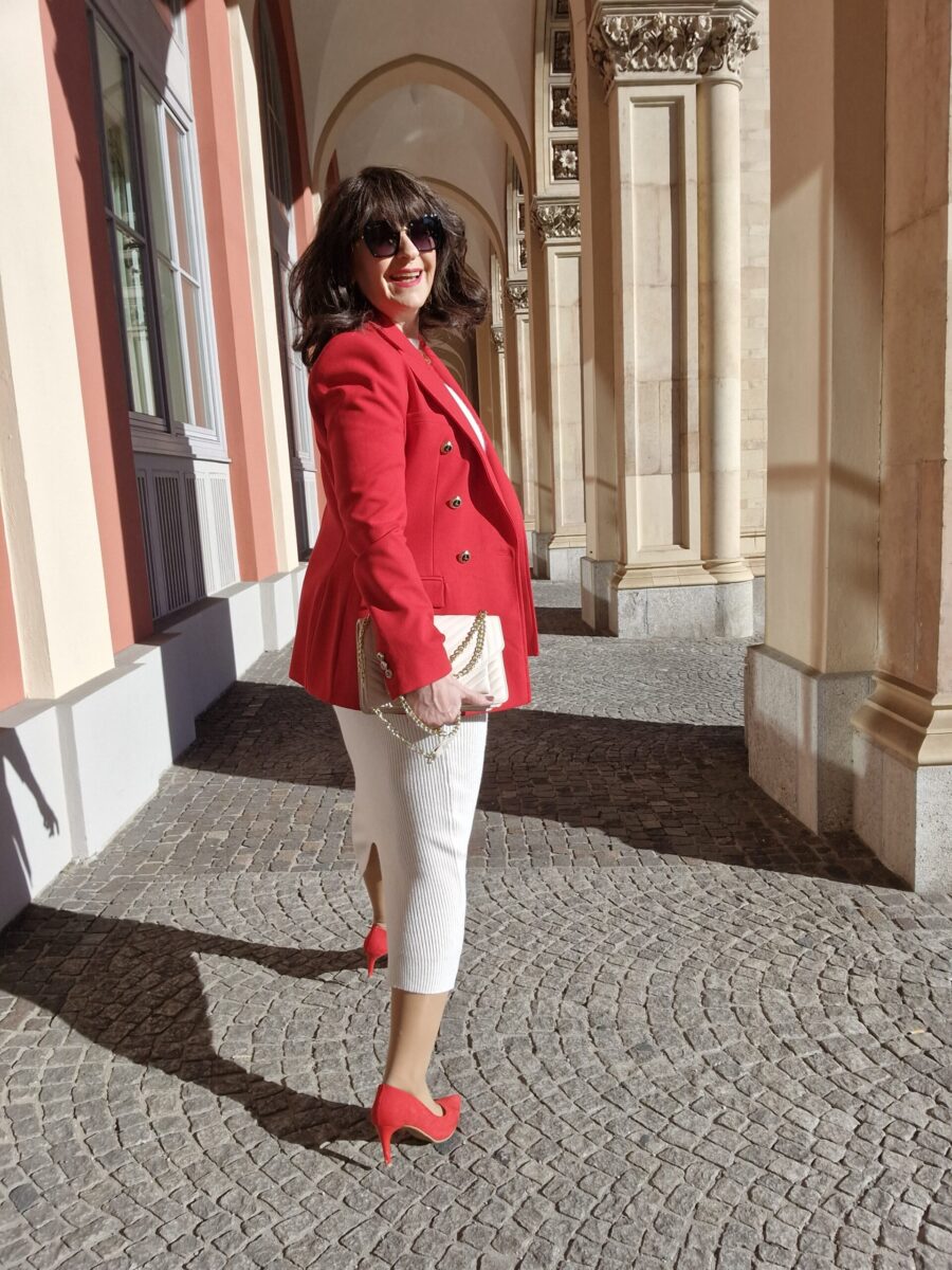 Ich bin wieder sehr begeistert von den wunderbaren Kombinationsmöglichkeiten. Auffallend schick finde ich den roten Blazer mit den roten Pumps, die sehen richtig toll aus.
