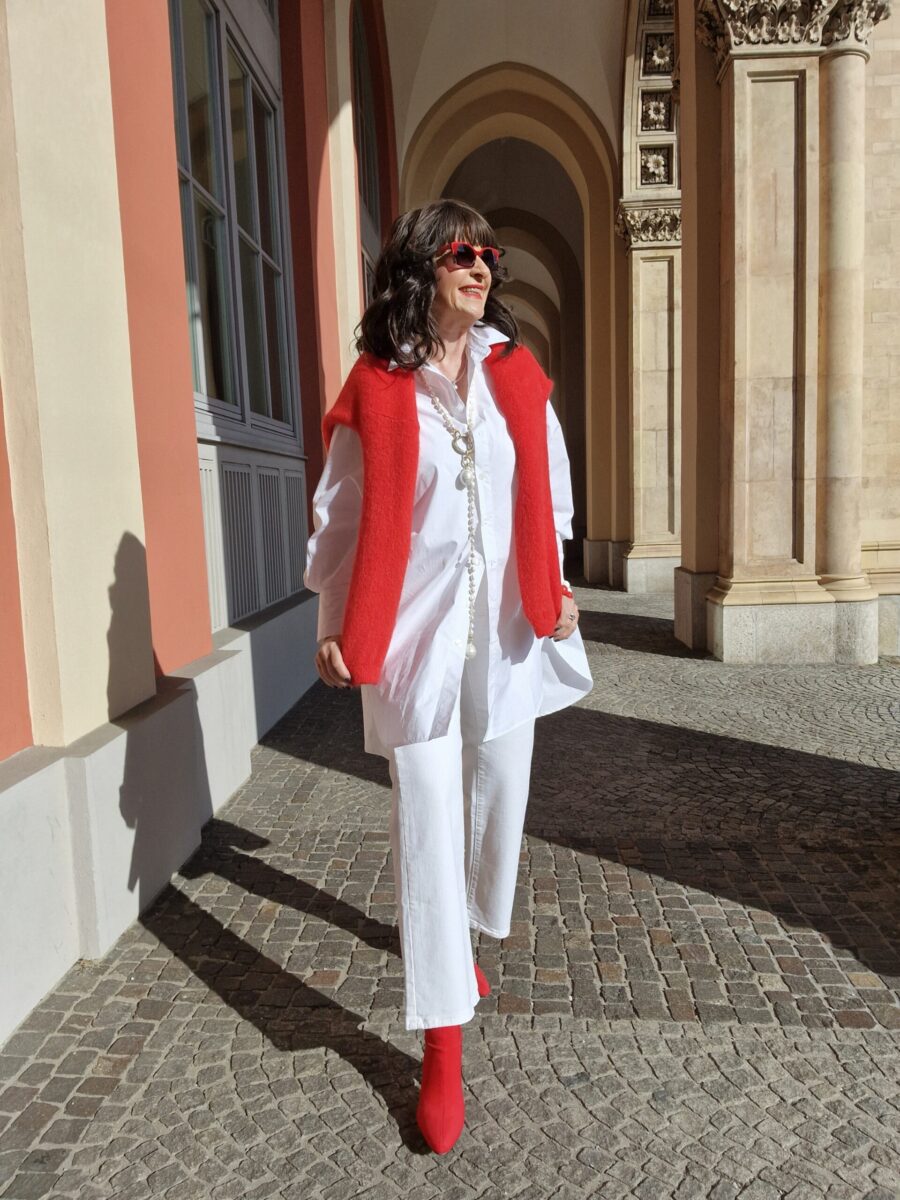 Bestimmt hast Du die Kombination von Rot und Weiß schon einmal getragen. Mein roter Pulli passt gerade in der jetzigen Jahreszeit hervorragend zu einer weißen Hose oder weißen Jeans. Bei Sonnenschein trage ich den roten Pullover als Modebegleiter leger über die Schultern gelegt. Rote Stiefeletten wiederholen den Rotton und bilden somit eine Einheit für einen stilvollen Look.