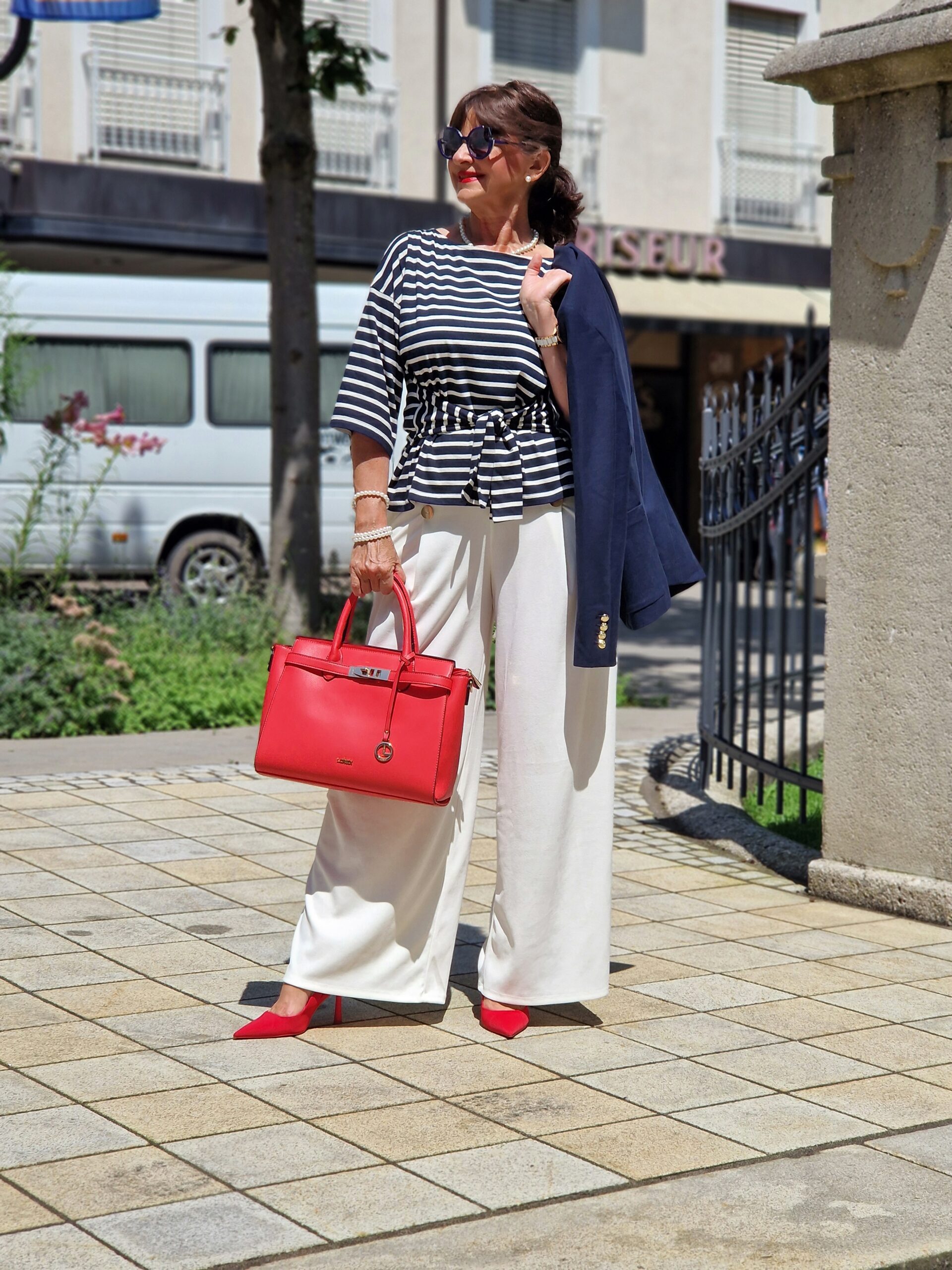 Mir fällt gerade auf, dass ich einen Schrank voller Jacken habe – aber keinen leicht kürzer geschnittenen blauen Blazer mehr besitze! Das muss ich unbedingt ändern. Weiße Hose, geringeltes Shirt und ein blauer Blazer sehen so frisch zusammen aus. Und dann noch die roten Accessoires – wunderbar. In meinem unendlichen Handtaschenfundus gibt es zum Glück auch eine in rot, die setzt dann einen feinen Akzent.