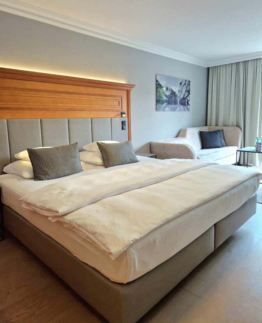 Die neu renovierten Zimmer und Suiten versprechen unaufdringlichen modernen alpenländischen Stil. Gleichzeitig bieten sie die Gelegenheit, im allerbesten Wohlfühl-Ambiente die Urlaubszeit zu genießen. Die geschmackvolle moderne traditionelle alpenländische Einrichtung lässt keinerlei Wünsche offen. Von der Kaffeemaschine (was mir enorm wichtig ist), einem luxuriösen Badezimmer, kuscheligen Bademantel, kostenfreies WLAN, Flachbildfernseher bis hin zum großen Kleiderschrank ist alles vorhanden, was man sich als Gast, von einem Luxushotel in den Bergen nur wünschen kann.