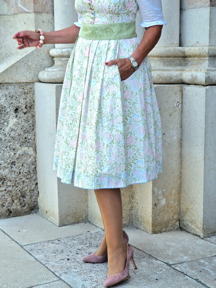 Das bunte Dirndl in den pastellfarbenen Tönen zeigt wie belebend ein warmer und schöner Sommertag gemacht werden kann, wobei der hellgrüne Gürtel und die roséfarbenen Pumps ein richtiger Hingucker sind.