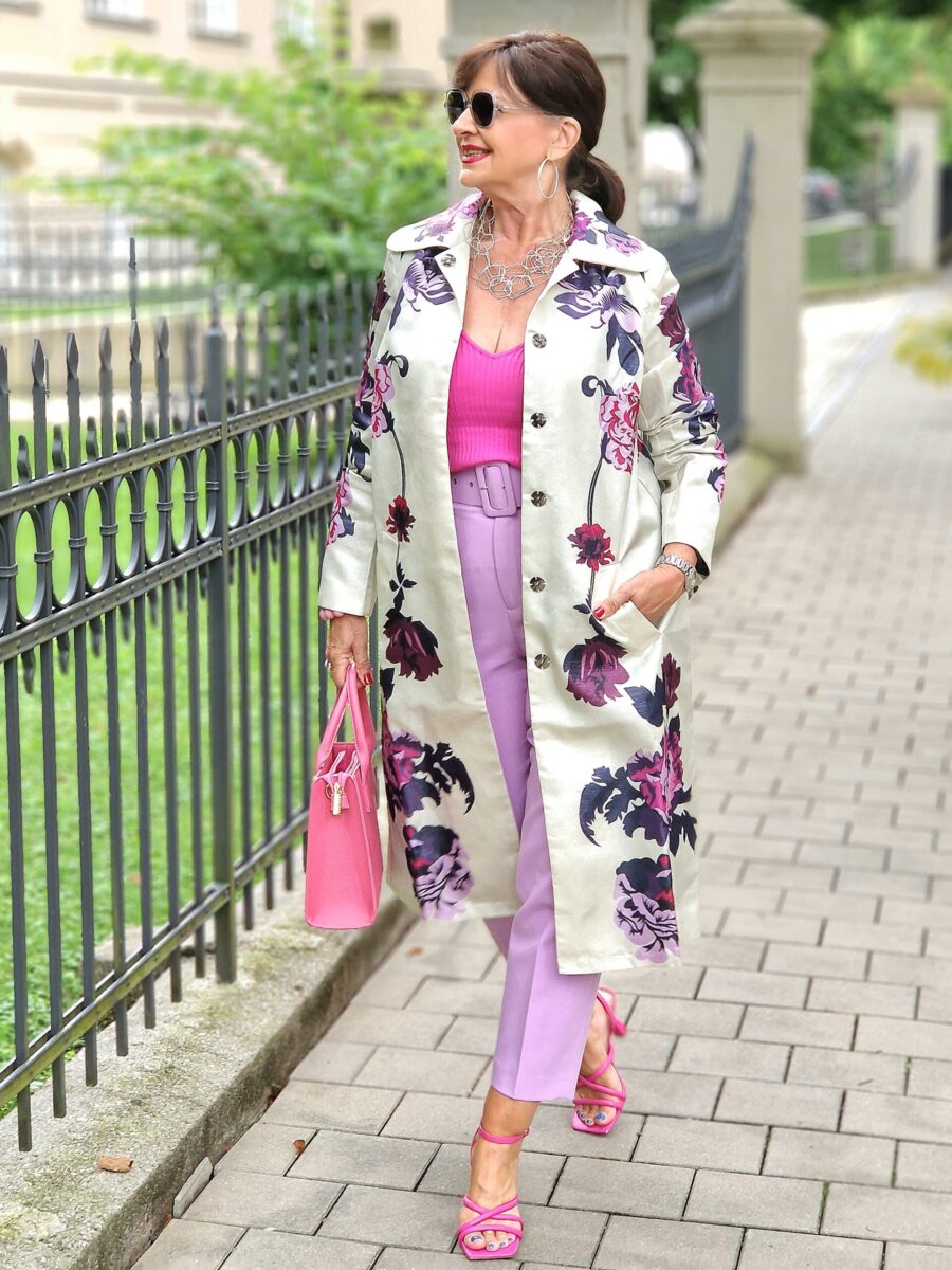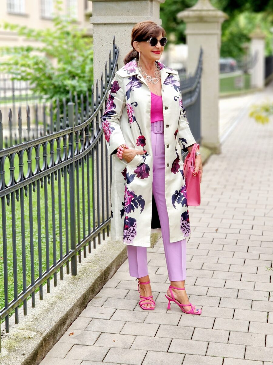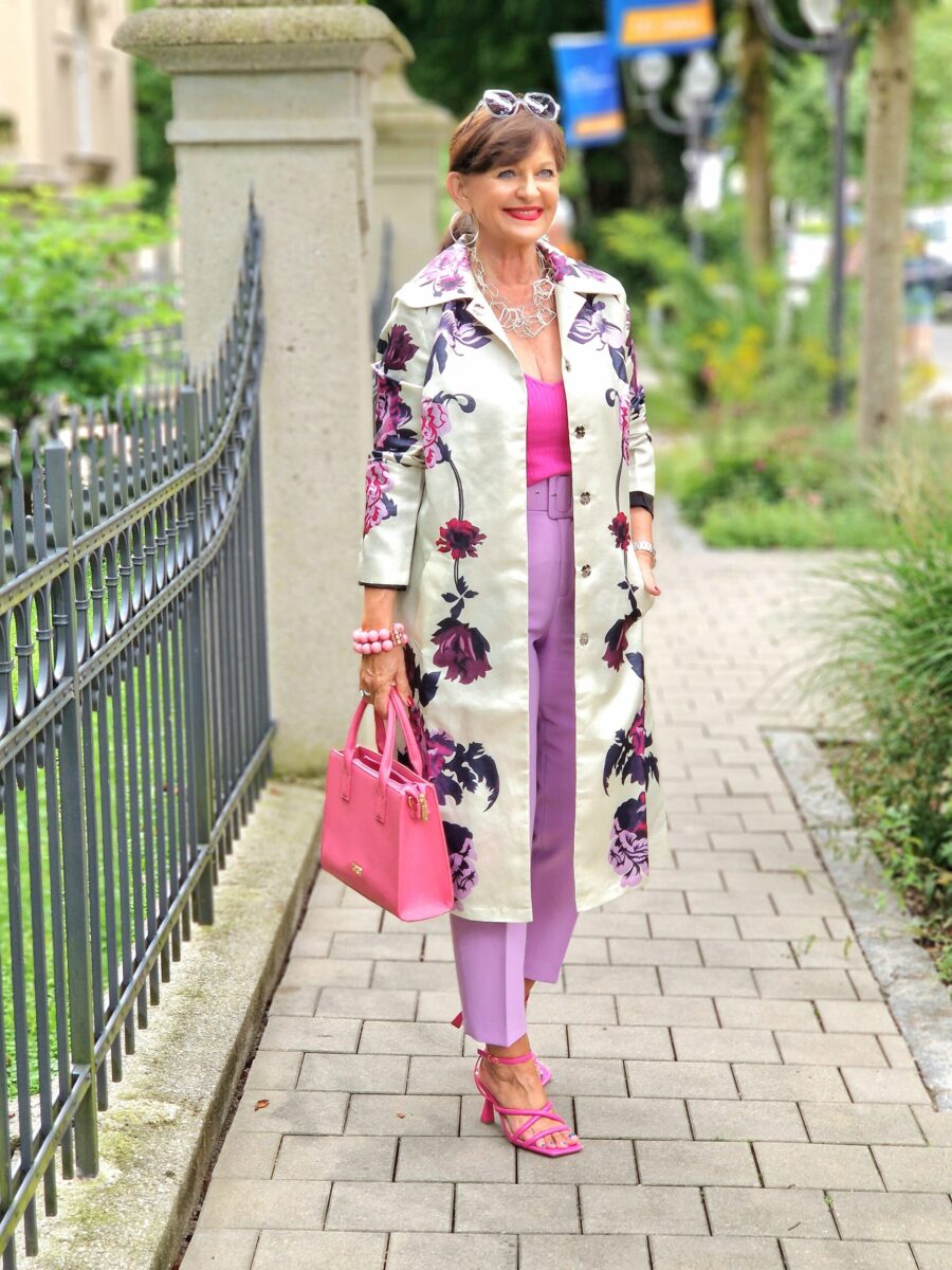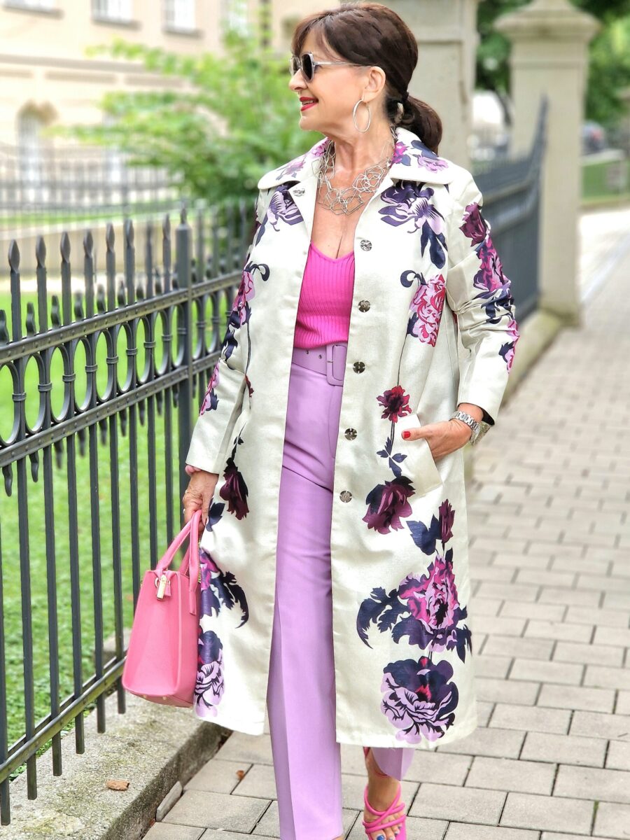 Der florale, lockere, elegante Trenchcoat ist ein Mantel mit Hingucker-Effekt. Mit Blütenmuster, pinker Hose und Top setzt die Trägerin ein absolutes Statement und zeigt ihre Stilsicherheit. Bist Du so mutig wie ich und lässt die Blüten blühen? Ich bin gespannt!