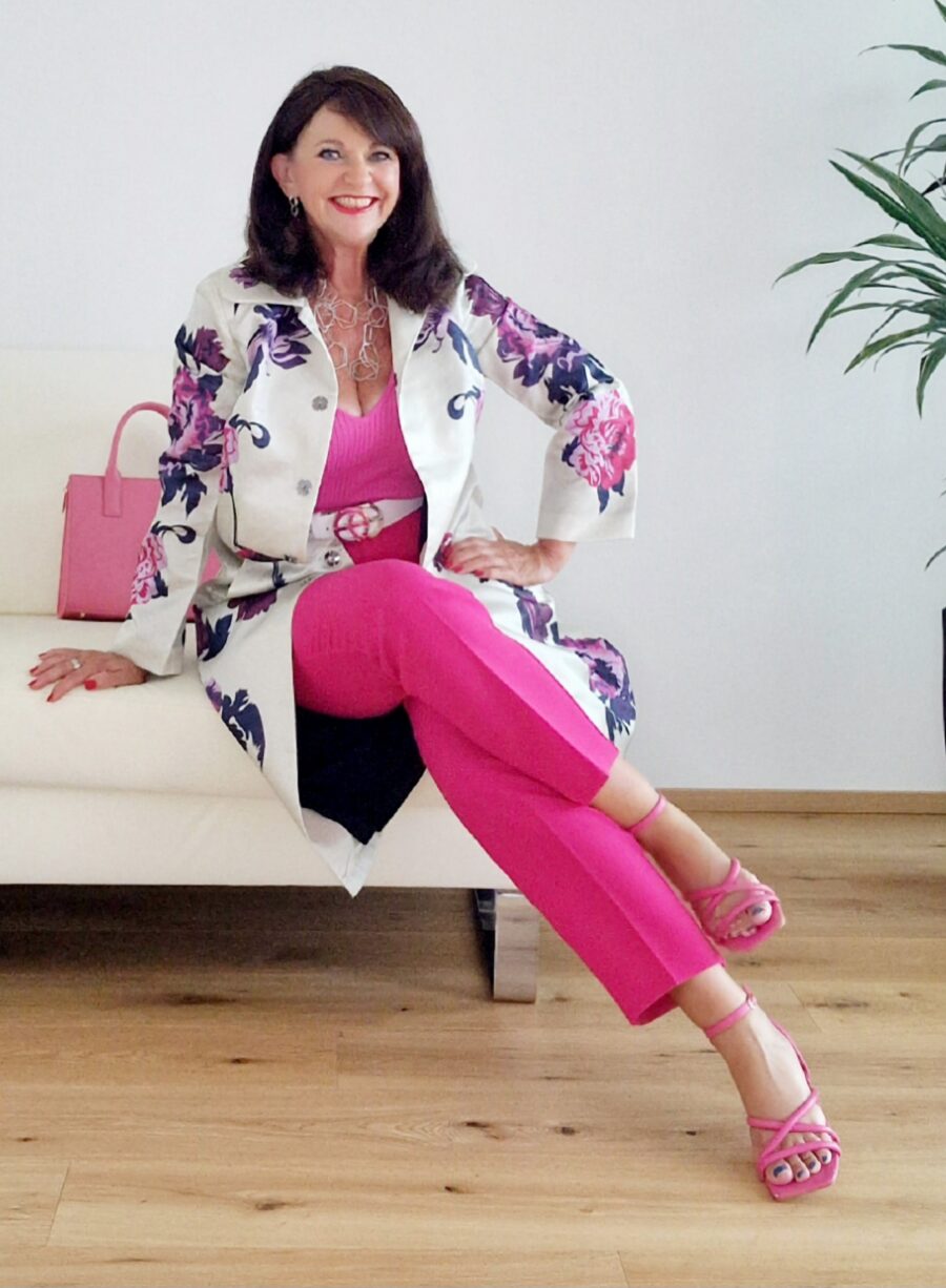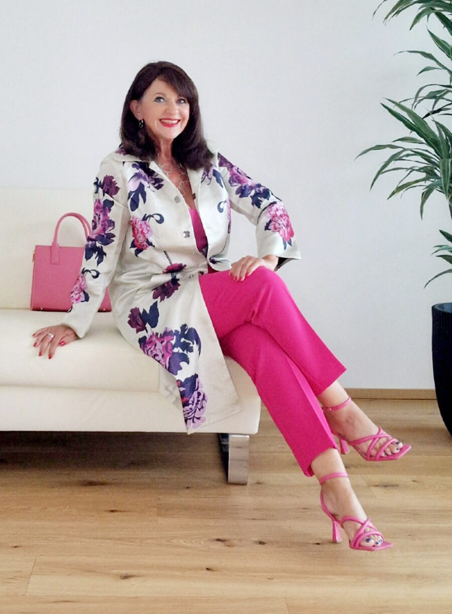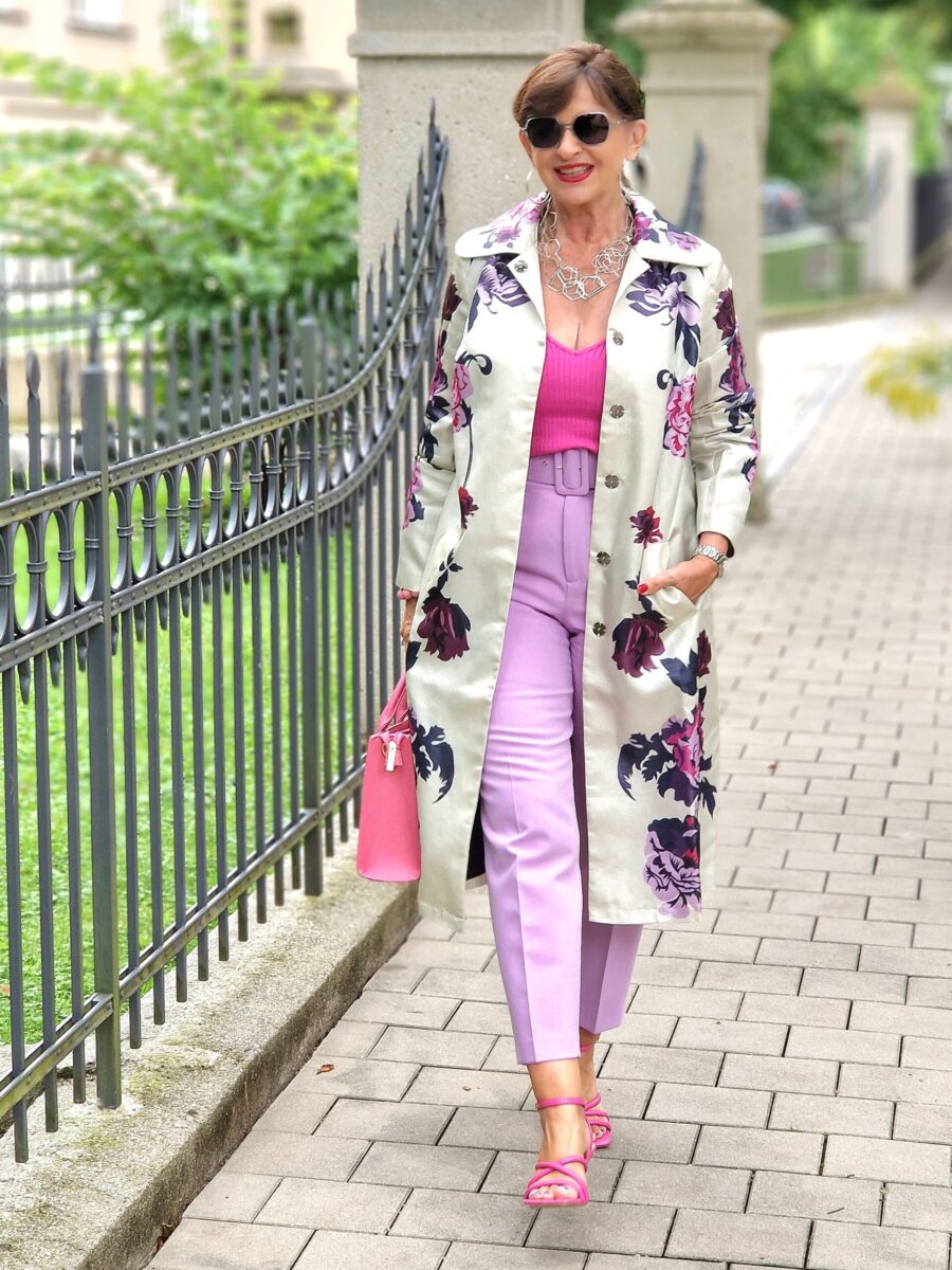Der florale, lockere, elegante Trenchcoat ist ein Mantel mit Hingucker-Effekt. Mit Blütenmuster, pinker Hose und Top setzt die Trägerin ein absolutes Statement und zeigt ihre Stilsicherheit. Bist Du so mutig wie ich und lässt die Blüten blühen? Ich bin gespannt!