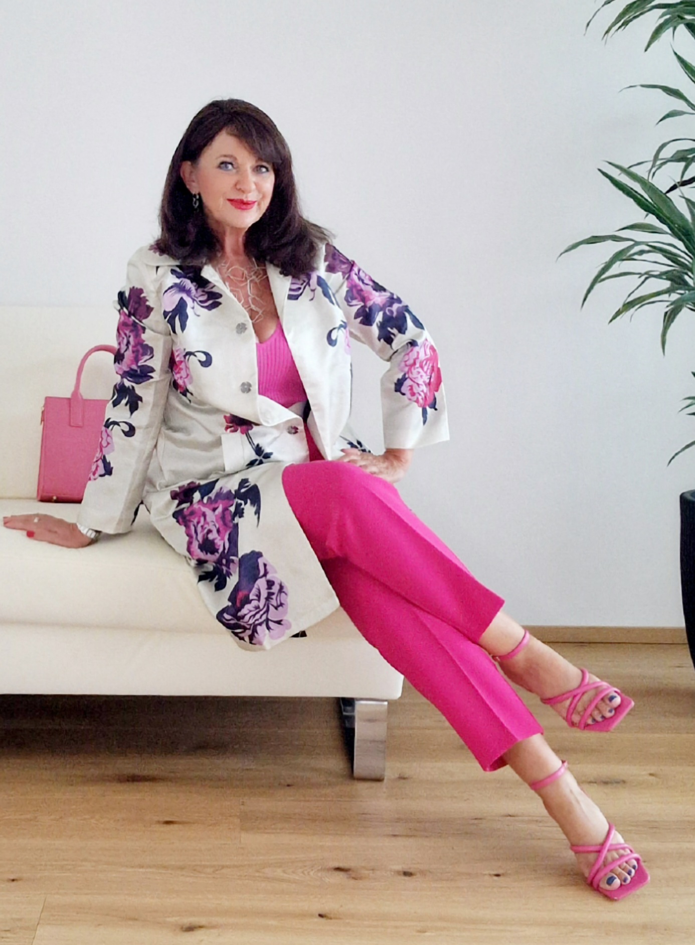 Die Farbe kommt in den Blüten sehr gut zum Vorschein. Da verschiedene Schattierungen zwischen Pink und Flieder im Mantel vorkommen, habe ich auf zwei Farben gesetzt, um den Effekt des Prints zu unterstreichen. Die Hose ist aus einem Hosenanzug gewählt, der schon längere Zeit in meiner Garderobe vorhanden ist.