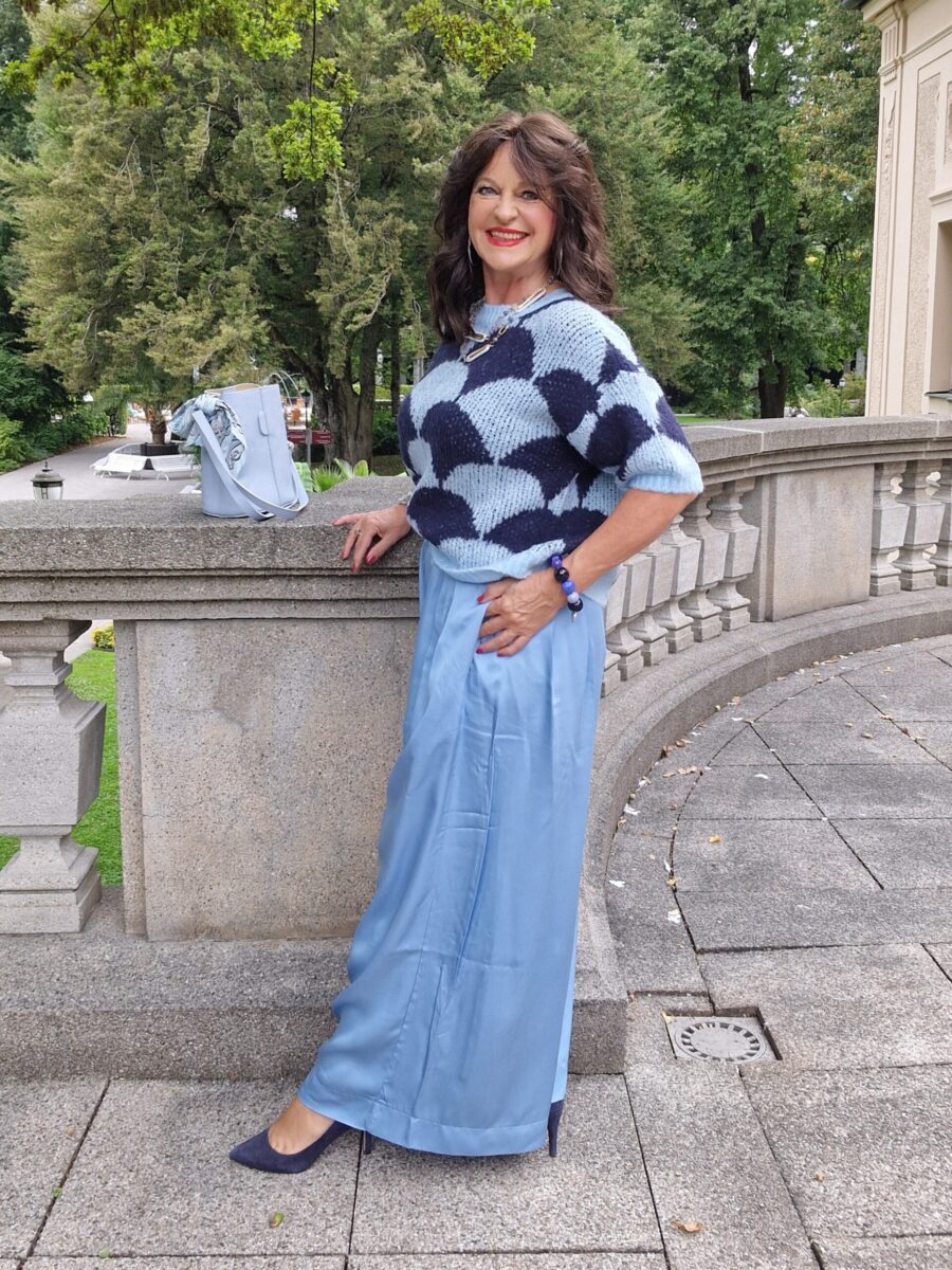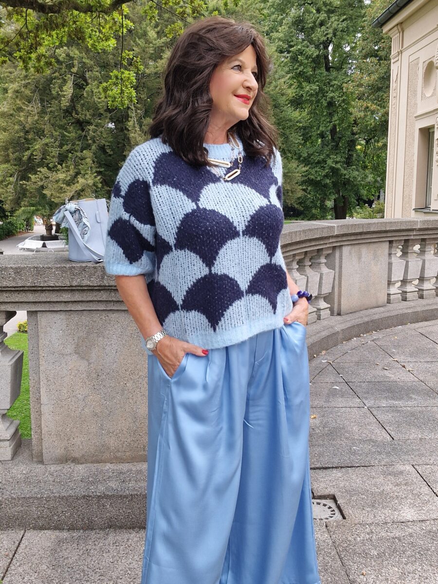 - Die weite Hose lässt sich sehr harmonisch mit einem edlen Blazer kombinieren. Bei der blauen Kombination kann ich mir einen dunkelblauen Blazer gut dazu vorstellen.