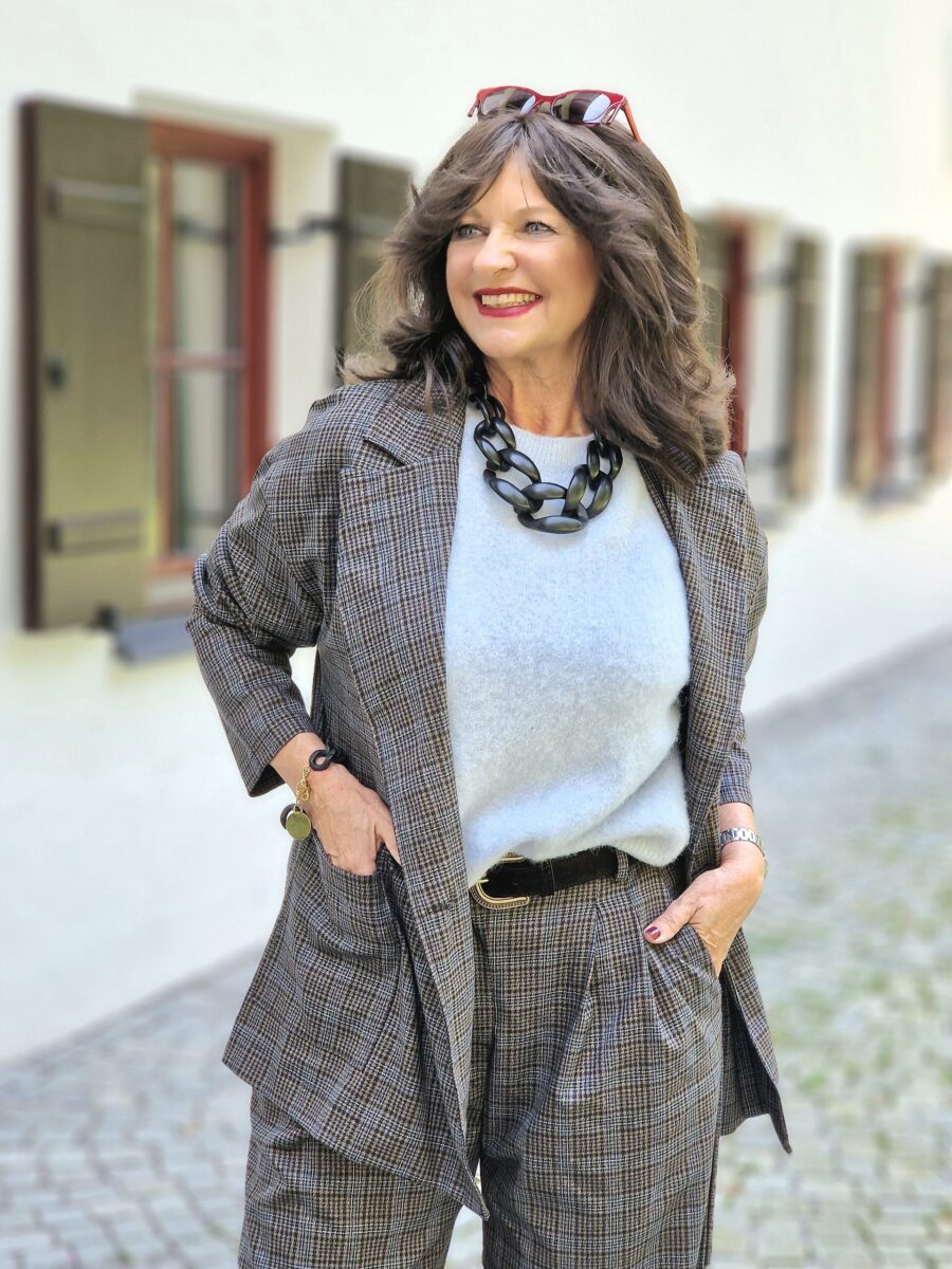 Ein Hosenanzug, oder wie er immer wieder genannt wird – Power-Suit, ist weiterhin ein Must-Have für den Herbst. Als Herbsttrend zählt die weiter geschnittene Hose VSENA und der gerade geschnittene Blazer VREMY zum Anzug. Um Hosenanzüge einen modischen Touch zu verleihen, trägt man leichte Pullis oder Shirts unter einem Hosenanzug. Da der Anzug einen leichten Blauverlauf in der Musterung beinhaltet, trage ich den hellblauen Pullover VAMY darunter. Flauschig weich und aus edler Baby Alpaka Wolle, mit halben Ärmeln gefällt er mir zu vielen vorhandenen Hosen und einem schwarzen Satinrock ausgesprochen gut.