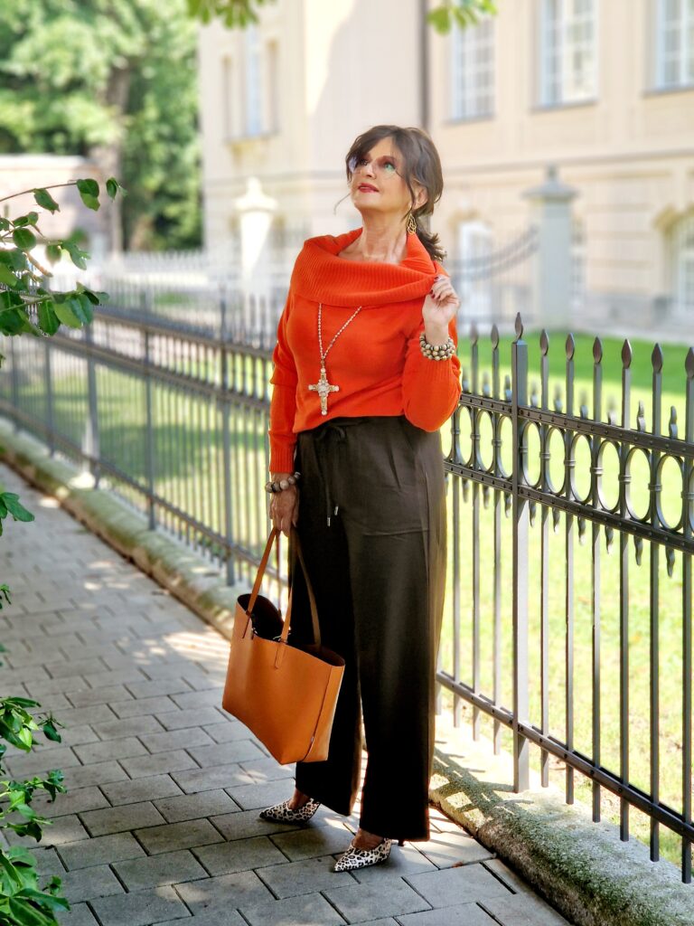 Color Blocking ist eine großartige Möglichkeit, im Herbst mit kräftigen Farben zu experimentieren. Den orangefarbene Pulli VVLADA, mit dem extravaganten Kragen, kombiniere ich mit der dunkelbraunen Hose VMAXIN. Das schafft einen einladenden Look, der perfekt zur herbstlichen Stimmung passt. Das leuchtende Orange bringt Energie und Frische in das Outfit, während das Braun eine erdige und beruhigende Basis bietet. Der Pullover kann durch das besondere Kragenvolumen unterschiedlich kreiert werden.