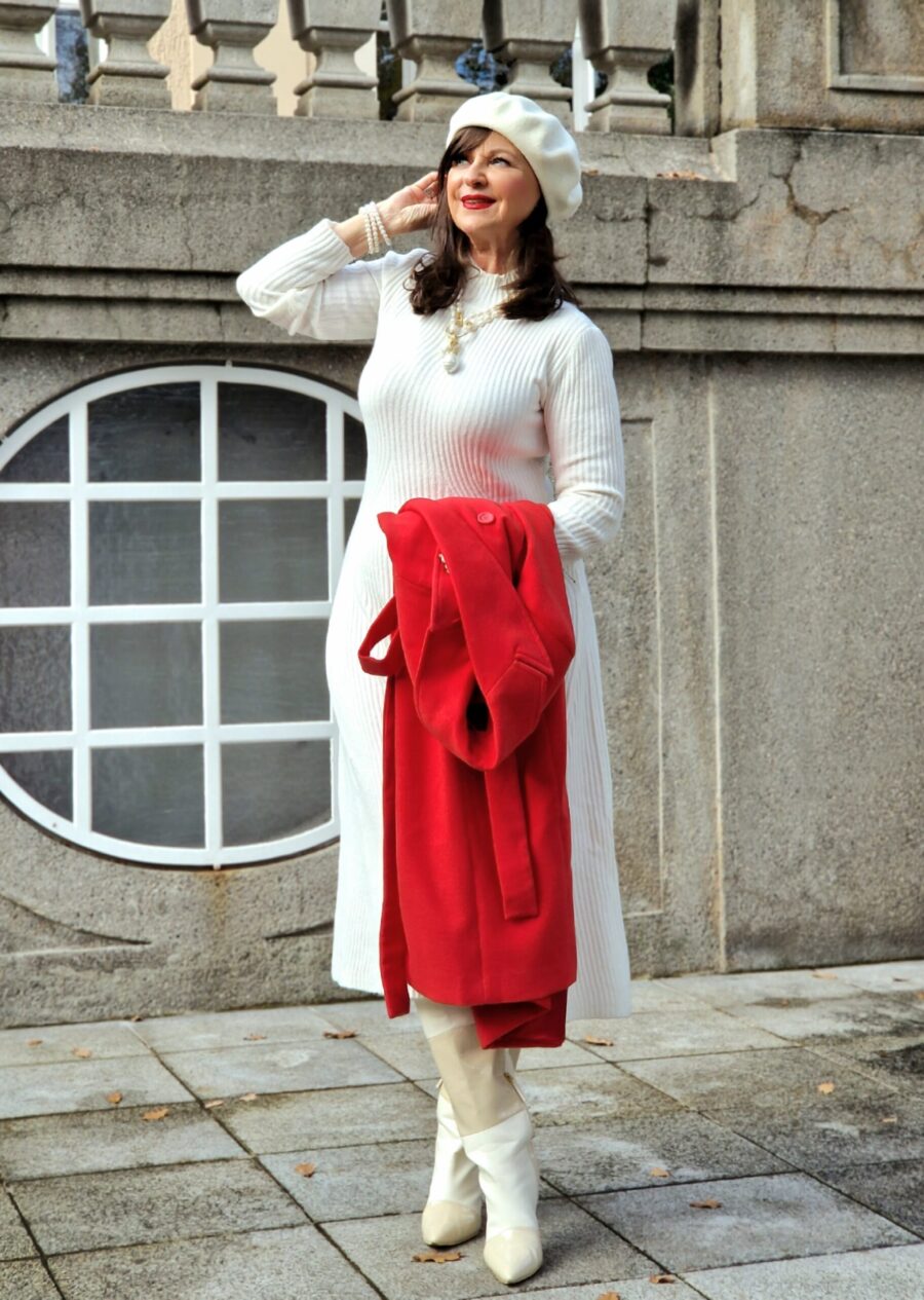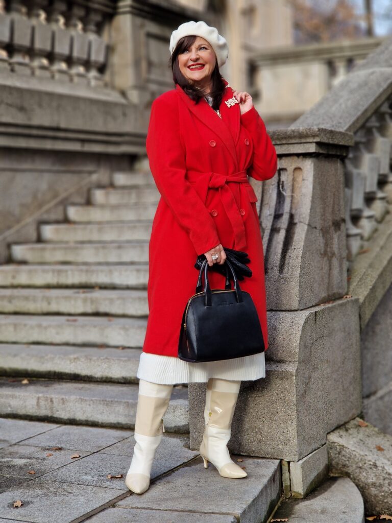 - Eleganter Look: Du siehst es auf den Bildern genau, die kniehohen hellen Stiefel und der rote Mantel sorgen für eine gewisse Eleganz. Der rote Mantel ist der perfekte Kombipartner für das wollweiße Strickkleid.