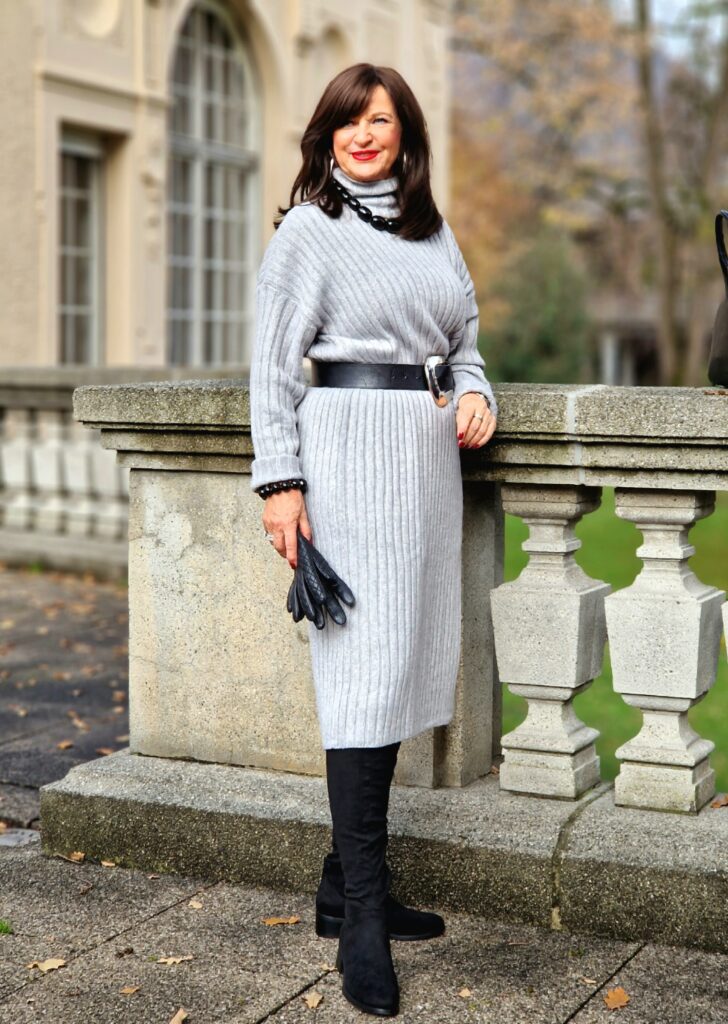 Grau hat in dieser Saison wieder einen hohen Stellenwert erreicht. Ich liebe diese Farbe schon immer. Von wegen „graues Mäuschen“. Ein graues Strickkleid kommt niemals aus der Mode. Es ist zeitlos und zu vielen Gelegenheiten die beste Wahl für ein passendes Outfit.