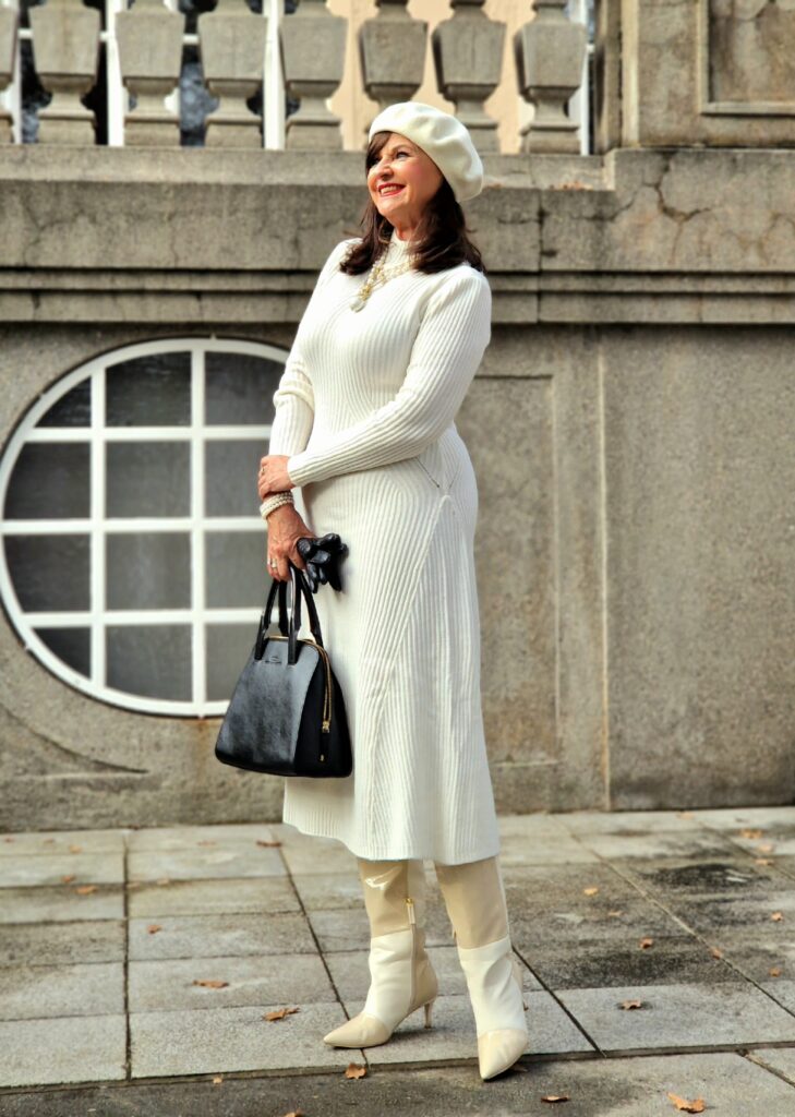 Der Look im weißen Strickkleid ist jedoch meiner Meinung nach genauso schick und ist richtig toll mit der weißen Baskenmütze und den weiß-beigen Lederstiefeln in Szene gesetzt.