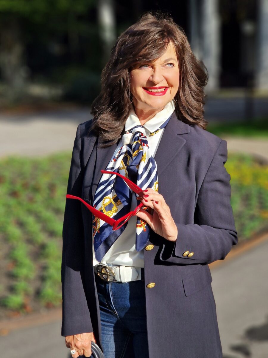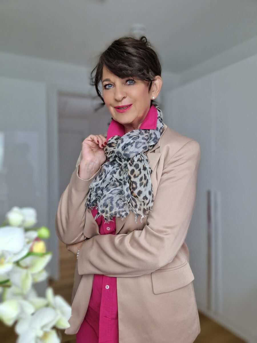 - Farben und Muster: Setze auf zeitlose Farben wie Grautöne, Marineblau oder Beige. Für einen modischen Akzent sind auch gemusterte Schals in klassischen Marinemuster oder zarten floralen Prints ideal. Animalprints sind so angesagt wie schon lange nicht mehr. Auch ich habe einige Schals mit diesem modernen Print in meiner Schalschublade.