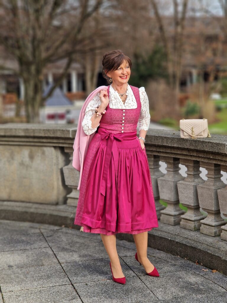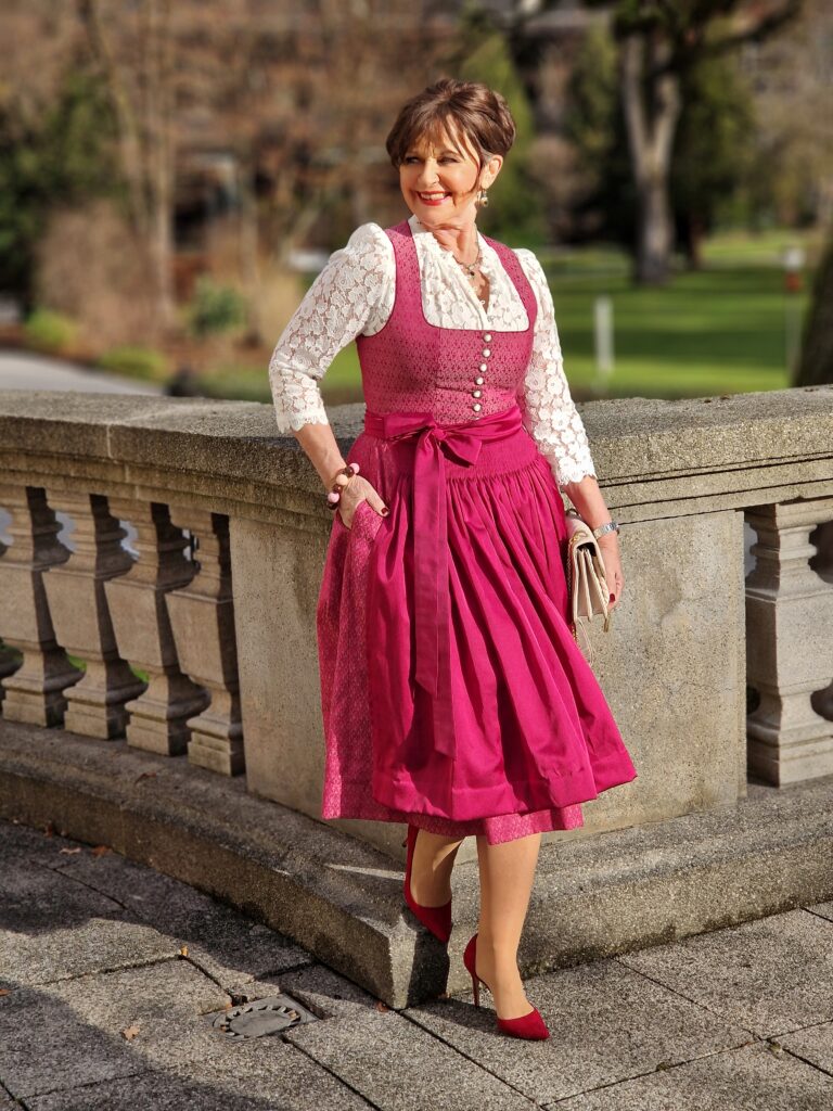 Die Farbigkeit wird durch die elegante Schürze nochmals für die Feiertage besonders hervorgehoben. Natürlich kann ich das Dirndl mit vielen anderen Schürzen kombinieren. Die Spitzenbluse hatte ich in meinem Dirndlschrank und sie unterstreicht den eleganten Touch für die Feiertage perfekt. Bestimmt werde ich das Dirndl zu einem der Weihnachtskonzerte der Philharmoniker in Bad Reichenhall tragen.