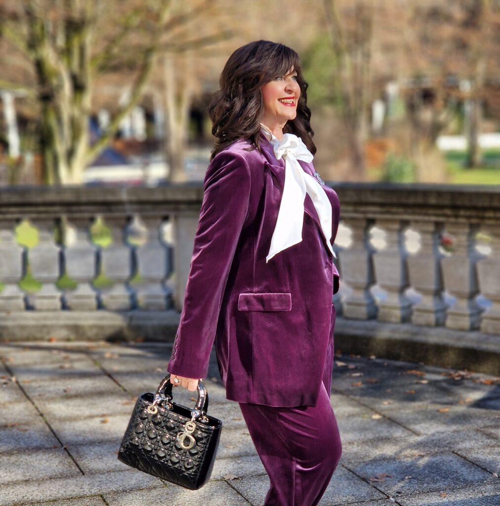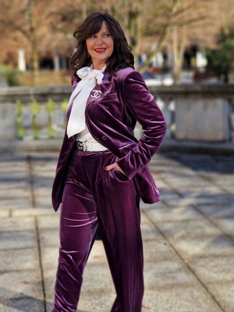 Samt gehört für mich zu festlichen Outfits an den Feiertagen seit vielen Jahren dazu. Ob es ein schwarzer Hosenanzug oder mein violetter Samtanzug ist, das ist Geschmackssache. Samt verleiht dem Look eine luxuriöse Wirkung und fühlt sich angenehm im Tragekomfort an.