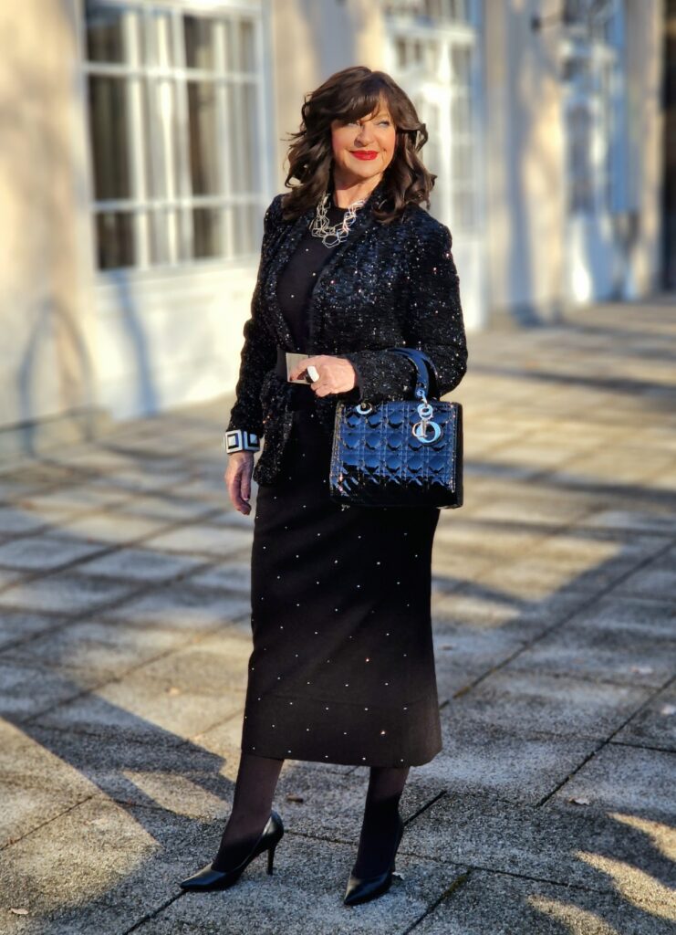 Ob glamourös mit Pailletten, die ich bereits letzten Jahr schon getragen habe, kuschelig im Strickkleid oder traditionell im feschen Designer-Dirndl – ich habe fünf zauberhafte Outfit-Ideen für Euch zusammengestellt. Wichtig dabei ist mir, dass diese Looks tragbar, stilvoll und für uns Ladys 50 und 60plus realisierbar sind. Mit Glanz und Eleganz werden wir nicht nur zu Weihnachten und Silvester gut aussehen, sondern diese Styling Ideen zu allen Konzert-, Theater- und Musical-Besuchen ebenfalls realisieren können.