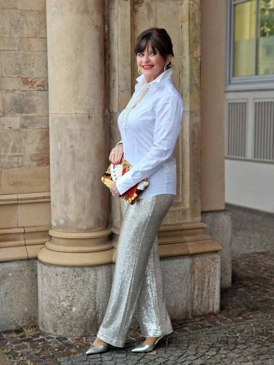 Für ein elegantes Feiertagsoutfit wähle ich eine Kombination aus einer Paillettenhose und einer Bluse. Eine silberfarbene Hose sorgt für die nötige Eleganz. Dazu kombiniere ich eine klassische Baumwollbluse. Mit eleganter großer Perlenkette bekommt die Bluse einen sehr festlichen Touch.