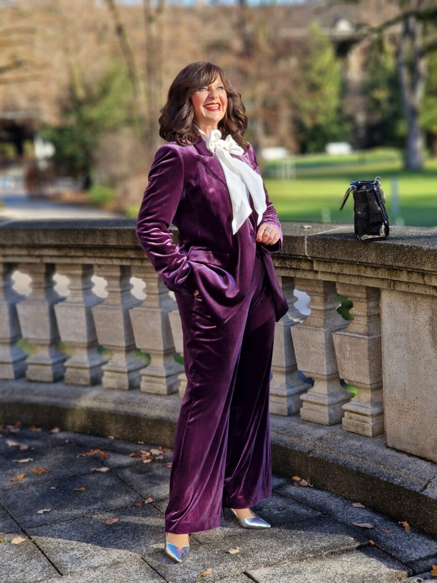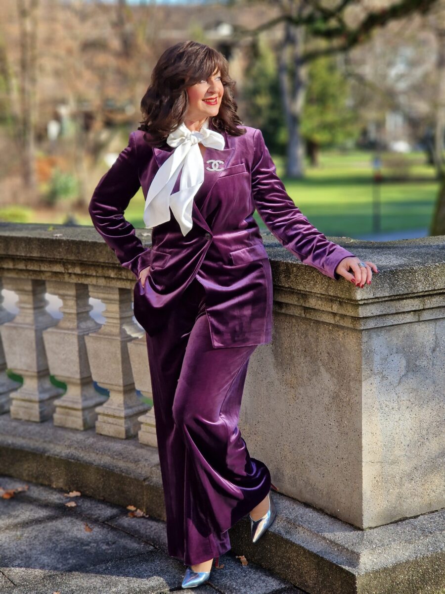 Samt gehört für mich zu festlichen Outfits an den Feiertagen seit vielen Jahren dazu. Ob es ein schwarzer Hosenanzug oder mein violetter Samtanzug ist, das ist Geschmackssache. Samt verleiht dem Look eine luxuriöse Wirkung und fühlt sich angenehm im Tragekomfort an.