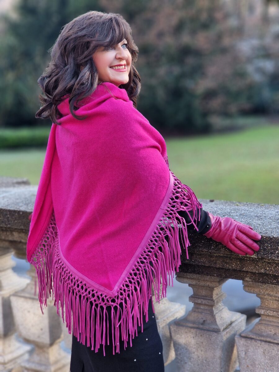 Eine weitere Alternative, den aparten Strickzweiteiler an den Feiertagen zu tragen, ist die Kombination mit einem atemberaubenden Cape. Das Cashmere-Cape mit den Lederfransen ist ein Einzelstück, welches ich mir auf der Trachtenmesse in Salzburg im Sommer gekauft habe. Es war Liebe auf den ersten Blick. Der Look bekommt mit dem Cape eine weitere Note an Individualität und ist ein echter Eyecatcher.