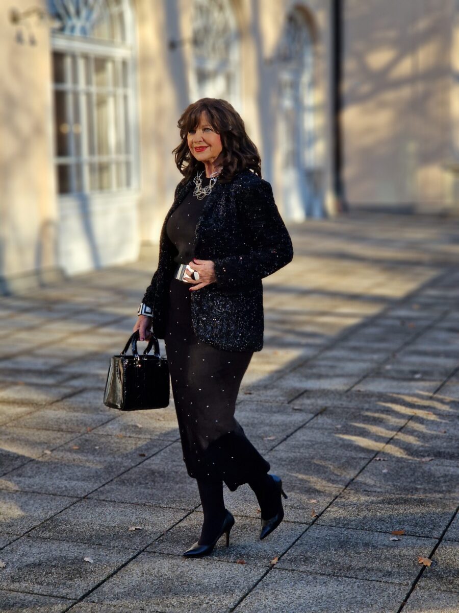 Für einen funkelnden und eleganten Look kombiniere ich den Strick-Zweiteiler mit einem Pailletten-Blazer. Der Glanz der Pailletten hebt den Look sofort auf ein neues Niveau und verleiht ihm eine festliche Note. Perfekt für besondere Anlässe oder Abendveranstaltungen, wie Theater, Konzert oder den Besuch einer Vernissage.