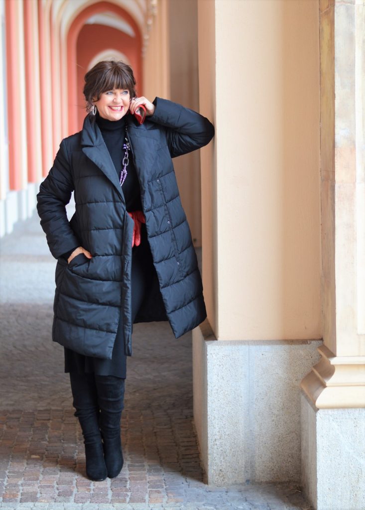 Daunenjacken bzw. -mäntel sind prima: Von praktisch über sportlich bis elegant einsetzbar und vor allem leicht und warm. Ich habe eine sehr dicke graue Daunenjacke, je einen schwarzen und orangenen Mantel in verschiedenen Längen. Den Letzteren mag ich besonders – wegen der Farbe und mittleren Länge.