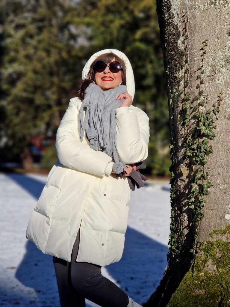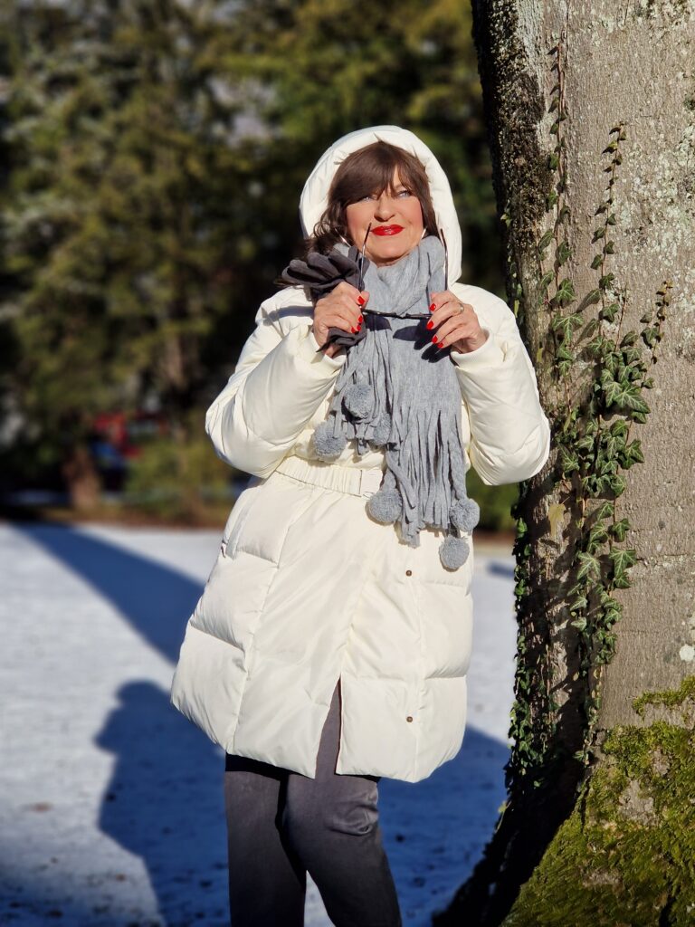 Eine helle Daunenjacke im Winter gefällt mir gut! Wenige trauen sich an diese Farbe heran, was ich persönlich gar nicht verstehen kann. Heutzutage sind die Materialien so pflegeleicht, dass nicht alles sofort in die Reinigung muss. Selbst meine Jacke kann ich im Schonwaschgang in der Waschmaschine reinigen.