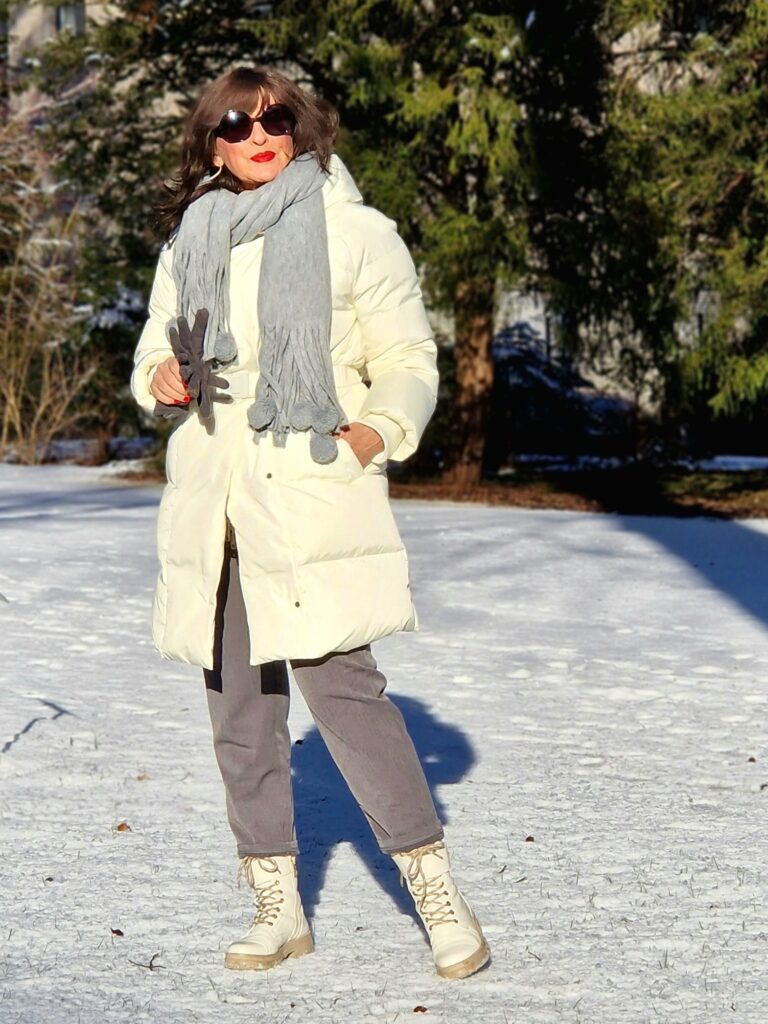 - Casual Chic Look: Ja, auch das geht! Ich kombiniere die taillierte Daunenjacke mit einer schicken Stoffhose und hellen Boots. Der große Schal, harmonisch auf die Hosenfarbe abgestimmt, und Handschuhe runden den eleganten Look ab.