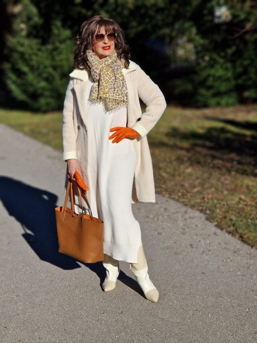 Ich kombiniere mein helles Strickkleid für einen frischen Look und passendem Strickmantel sowie tollen Accessoires, wie Schal und farbigen Handschuhen. Ganz klar, im Februar können wir unsere Strickkleider noch wunderbar anziehen, denn schließlich sind wir noch im Winter.