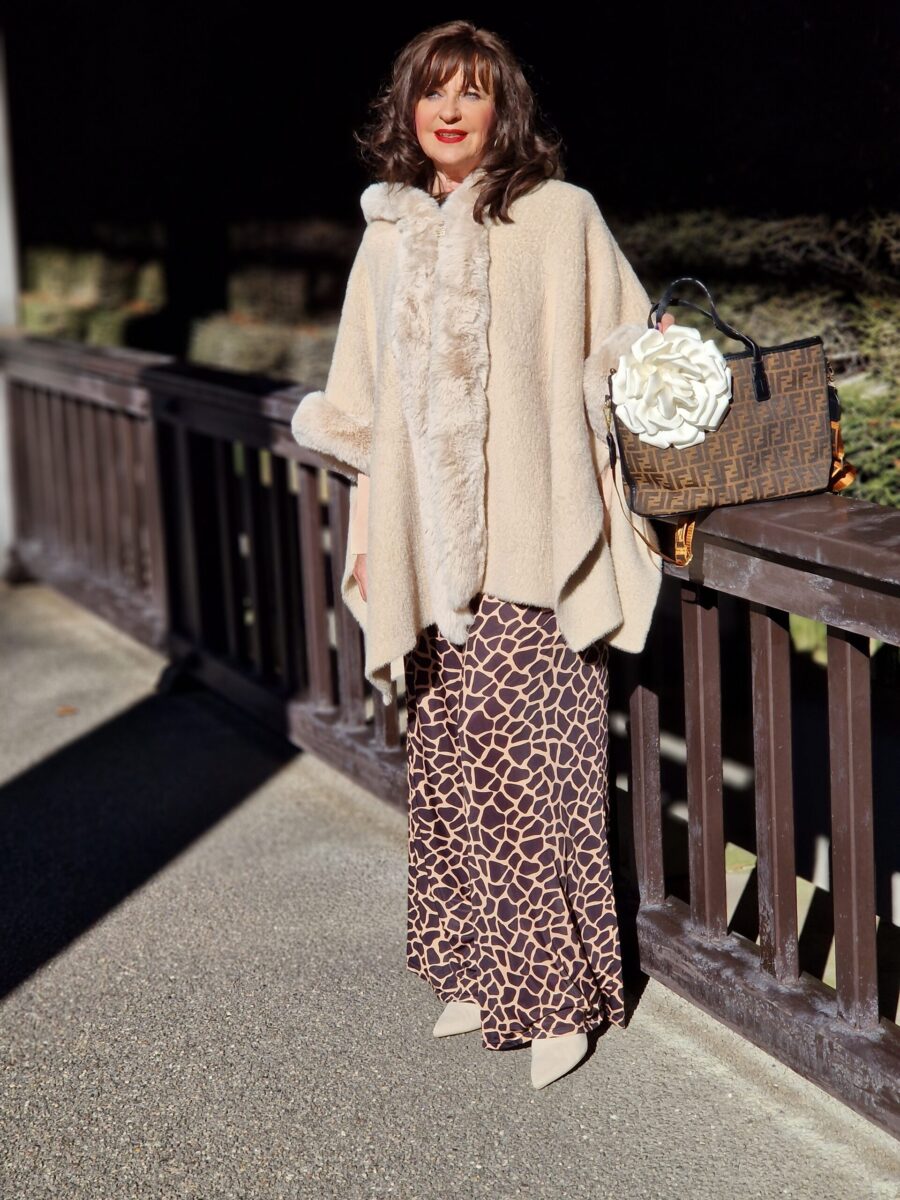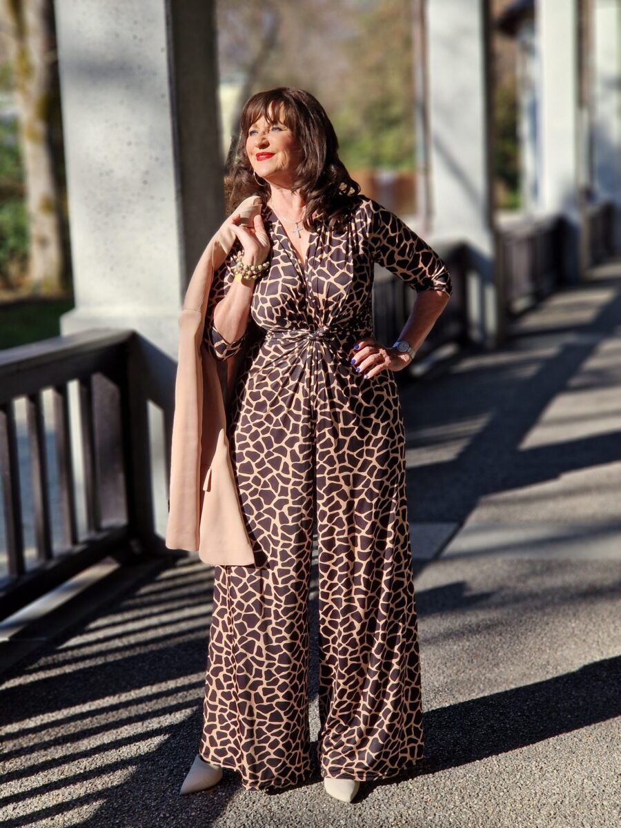 Mein Jumpsuit mit auffälligem Print ist nicht nur bequem, sondern gleichzeitig ein echter Hingucker und Figurschmeichler. Im Oberkörper ist er anliegend, die Taille wird mit einer Raffung in Szene gesetzt und die weiten Hosenbeine geben dem Jumpsuit einen modernen Touch. Ich kombiniere ihn mit einem tollen Cape, das ich im letzten Jahr in Salzburg gekauft habe. Das Cape gibt dem Look eine elegante Note bekommt. Unter dem Cape trage ich einen Blazer und einen Gürtel dazu.